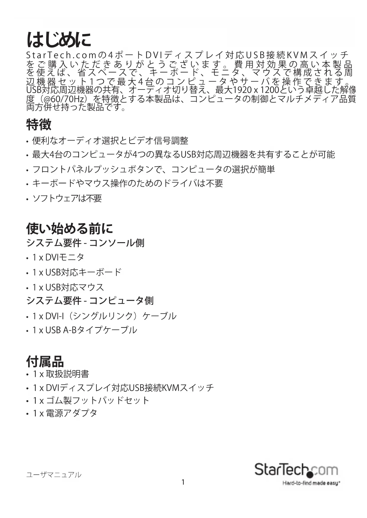 StarTech.comの4ポートDVIディスプレイ対応USB接続KVMスイッチ をご購入いただきありがとうございます。費用対効果の高い本製品 を使えば、省スペースで、キーボード、モニタ、マウスで構成される周 辺機器セット1つで最大4台のコンピュータやサーバを操作できます。 USB対応周辺機器の共有、オーディオ切り替え、最大1920 x 1200という卓越した解像 度(@60/70Hz)を特徴とする本製品は、コンピュータの制御とマルチメディア品質を 両方併せ持った製品です。