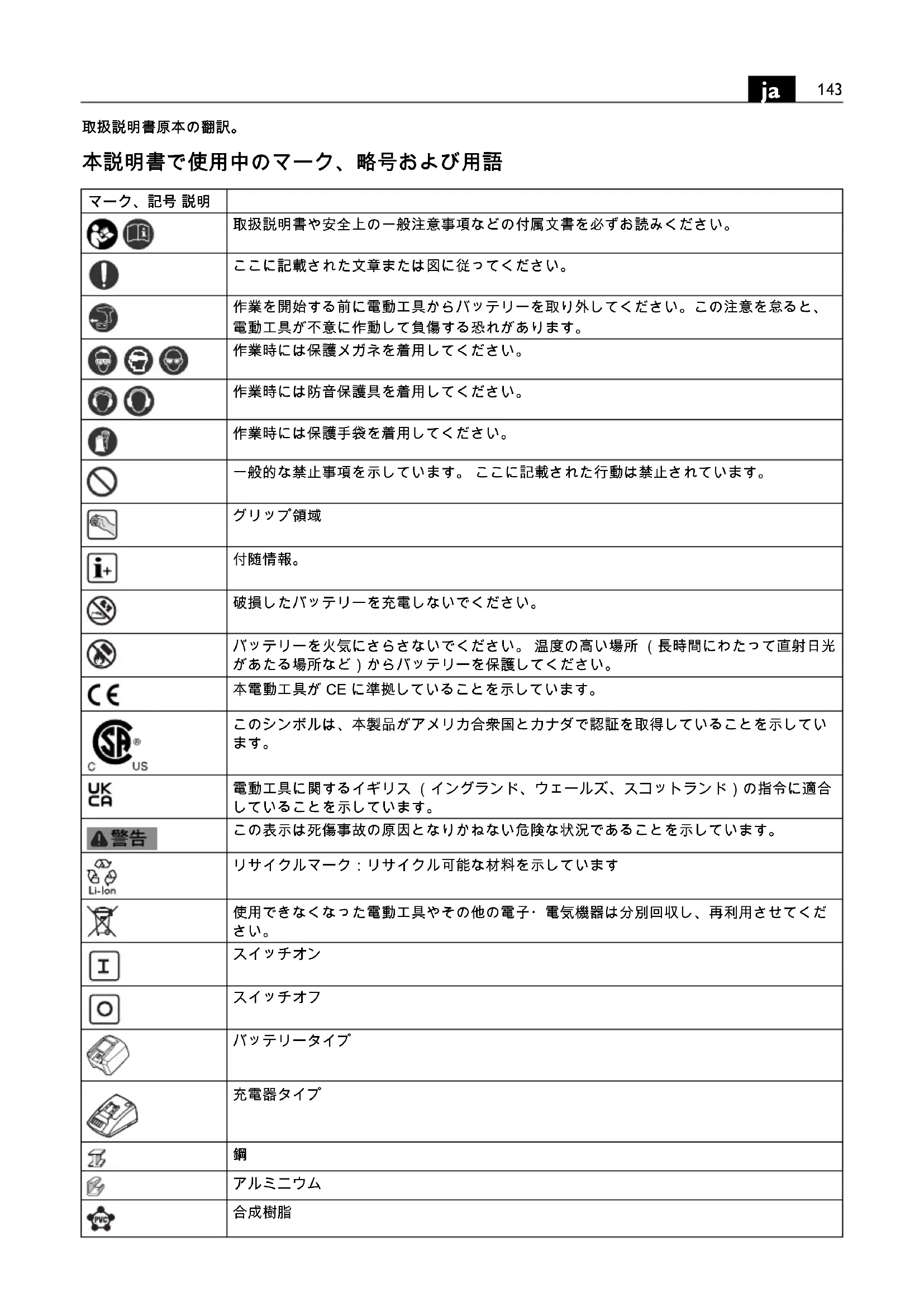 破損したバッテリーを充電しないでください。 バッテリーを火気にさらさないでください。 温度の高い場所 (長時間にわたって直射日光 があたる場所など)からバッテリーを保護してください。 本電動工具が CE に準拠していることを示しています。 このシンボルは、本製品がアメリカ合衆国とカナダで認証を取得していることを示してい