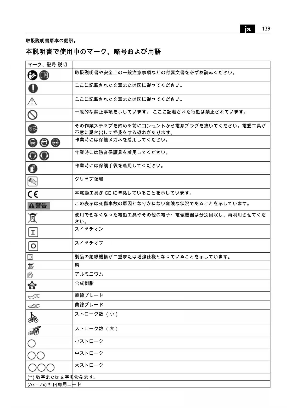 本電動工具が CE に準拠していることを示しています。 この表示は死傷事故の原因となりかねない危険な状況であることを示しています。 使用できなくなった電動工具やその他の電子・電気機器は分別回収し、再利用させてくだ