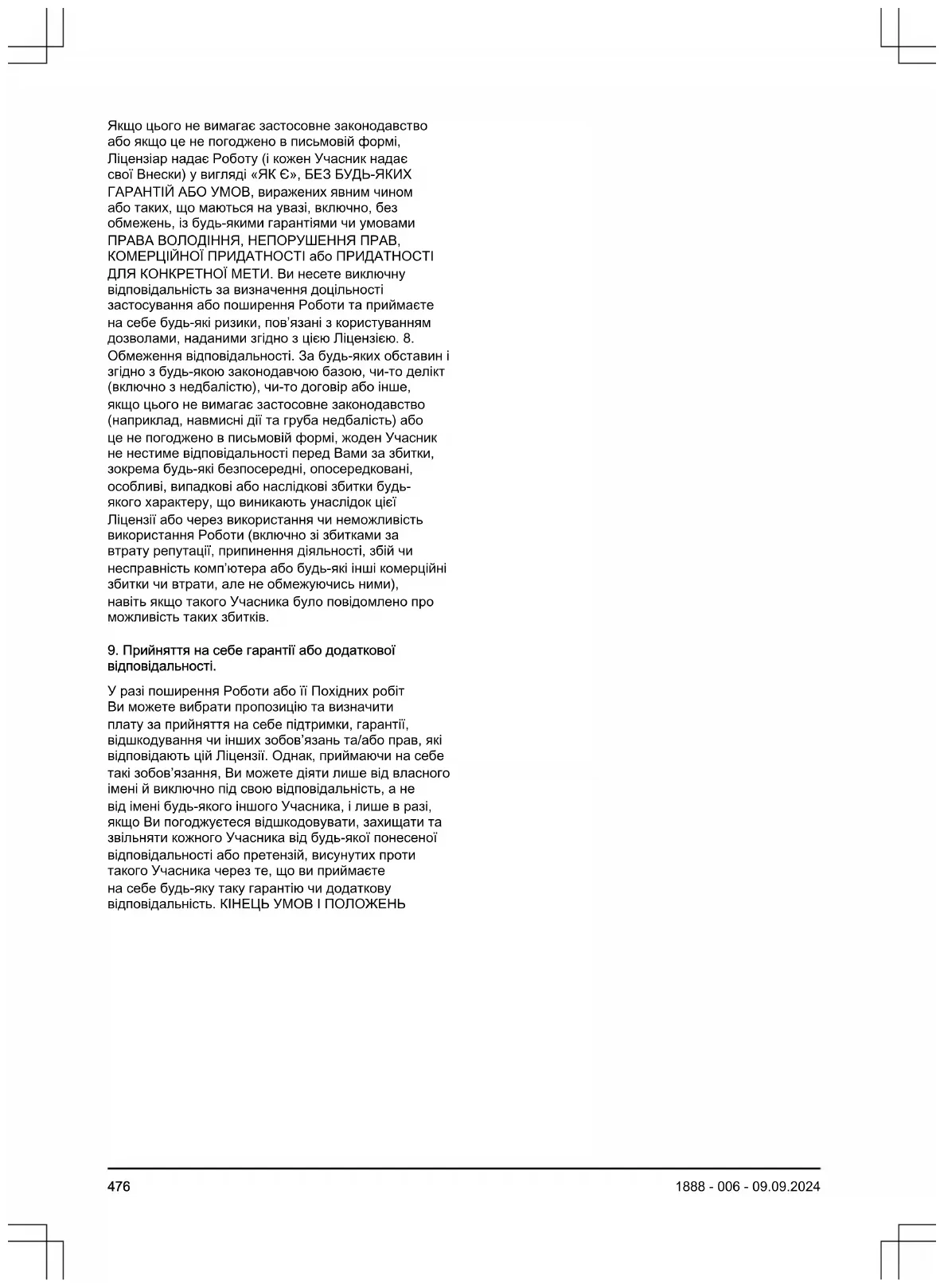 7.保証の否認。 適用法によって要求された場合、または書面により同意 された場合を除き、ライセンサーは、いかなる種類の保 証または条件でも「現状のまま」(権利、非侵害、商品 性、または特定目的の保証と条件を制限なく含む)を明 示的または黙示的に著作物を提供します(および各コン トリビュータはそのコントリビューションを提供しま す)。お客様は、著作物の使用または再配布の適切性を判 断する責任を単独で負い、本ライセンスに基づく許可の 行使に関連するリスクを負うものとします。8.賠償責任 の制限。いかなる法的理論においても、不法行為(過失 を含む)、契約、その他の方法にかかわらず、適用法(意 図的かつ重大な過失行為など)により要求された場合、 または書面で合意された場合を除き、コントリビュータ は、本ライセンスに起因する、または著作物の使用また は使用不能に起因するあらゆる性質の直接的損害、間接 的損害、特別損害、偶発的損害、派生的損害(業務上の 信用の喪失、作業停止、コンピュータの故障または誤作 動、またはその他のすべての商業的損害または損失など を含むがそれらに限定されない)について、当該コント リビュータが上記損害の発生する可能性について知らさ れている場合でも、責任を負わないものとします。 9.保証または追加責任の同意。 著作物またはその二次的著作物を再配布する場合、お客 様は、本ライセンスに準拠したサポート、保証、補償、 またはその他の責任義務および/または権利を提供し、 料金を請求することができます。ただし、当該義務に同 意する場合、お客様は、各コントリビュータに生じた責 任またはそのコントリビュータに対して主張された申し 立てについて、各コントリビュータを補償し、弁護し、 損失を与えないことに同意した場合に限り、当該保証ま たは追加責任にお客様が同意することを理由として、他 のコントリビュータの代理ではなく、お客様自身がお客 様の単独責任で行動することができます。利用規約の終