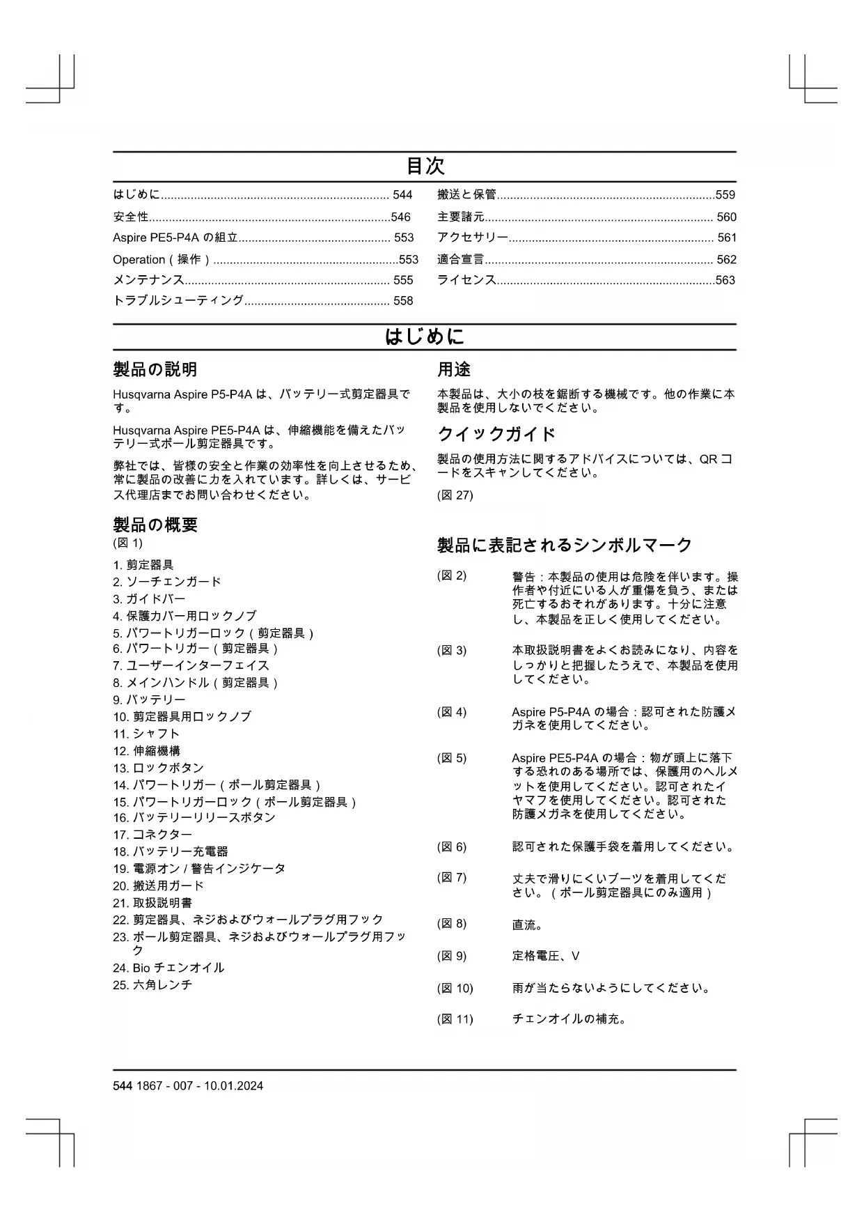 - ポール剪定器具は、ソーチェンが隠れた配線や自身 のコードに接触する可能性があるため、絶縁グリッ プ面だけを掴んでください。 ソーチェンが「通電」 している配線に接触することで、ポール剪定器具の 露出している金属部分が「通電」状態となることが あり、使用者が感電する危険性があります。 1867 - 007 - 10.01.2024 547• 防護メガネを着用してください。さらに、聴覚、頭、 手、脚と足用の身体保護具の着用を推奨します。適 切な身体保護具を着用することで、飛び散る破片に よる怪我やソーチェンの接触事故を軽減できます。