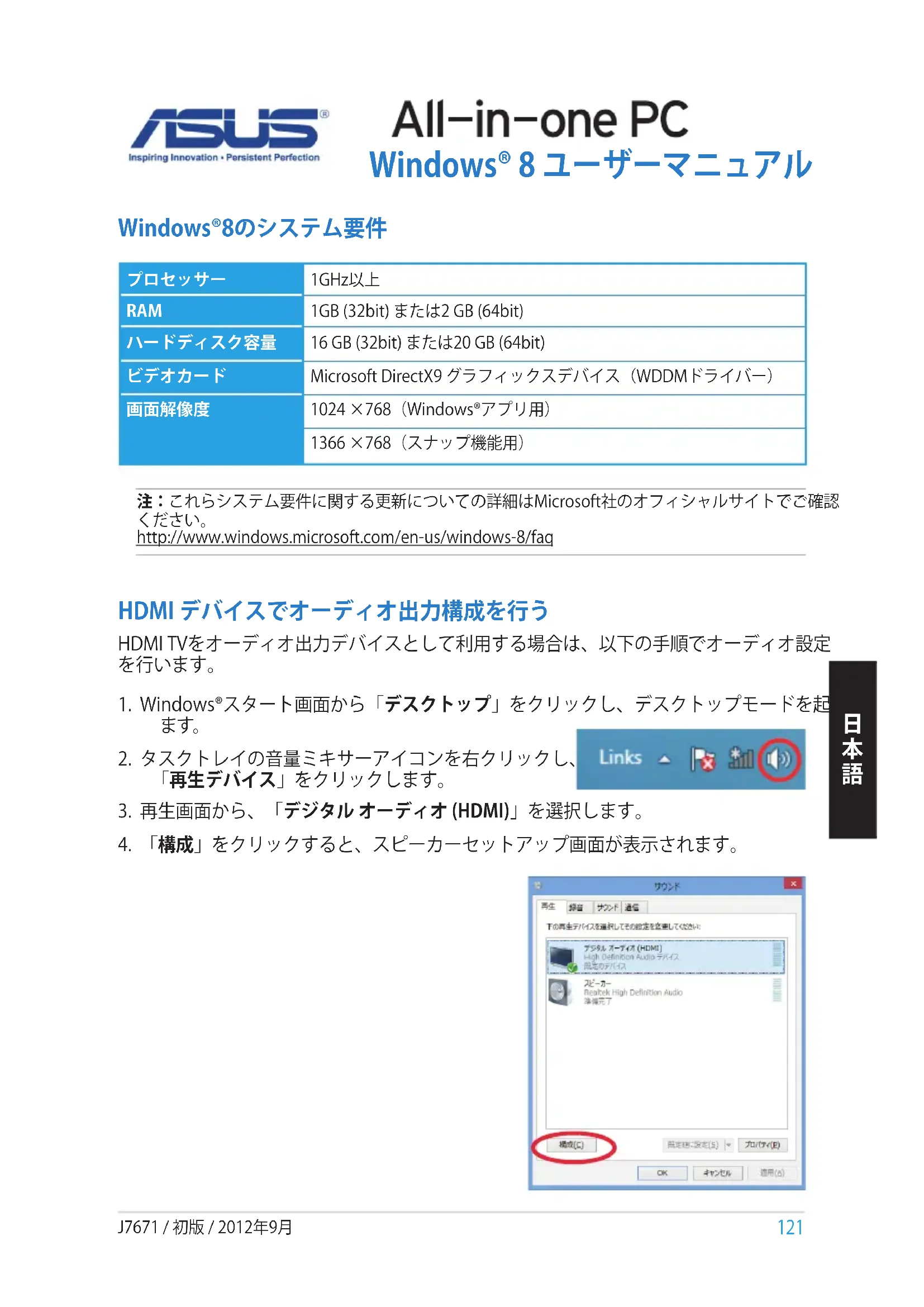 pengaturan ulang.120 Bahasa Indonesia Bahasa Indonesia CATATAN: Download versi multibahasa panduan pengguna ini dari situs Dukungan ASUS di http://support.asus.com121 Windows® 8 ユーザーマニュアル HDMI デバイスでオーディオ出力構成を行う HDMI TVをオーディオ出力デバイスとして利用する場合は、以下の手順でオーディオ設定