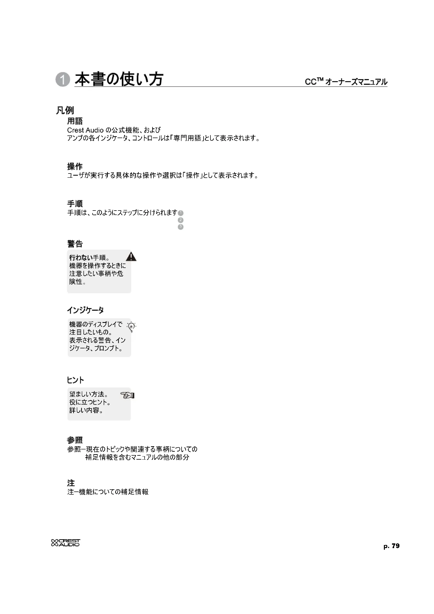 Crest Audio の公式機能、および アンプの各インジケータ、コントロールは「専門用語」として表示されます。