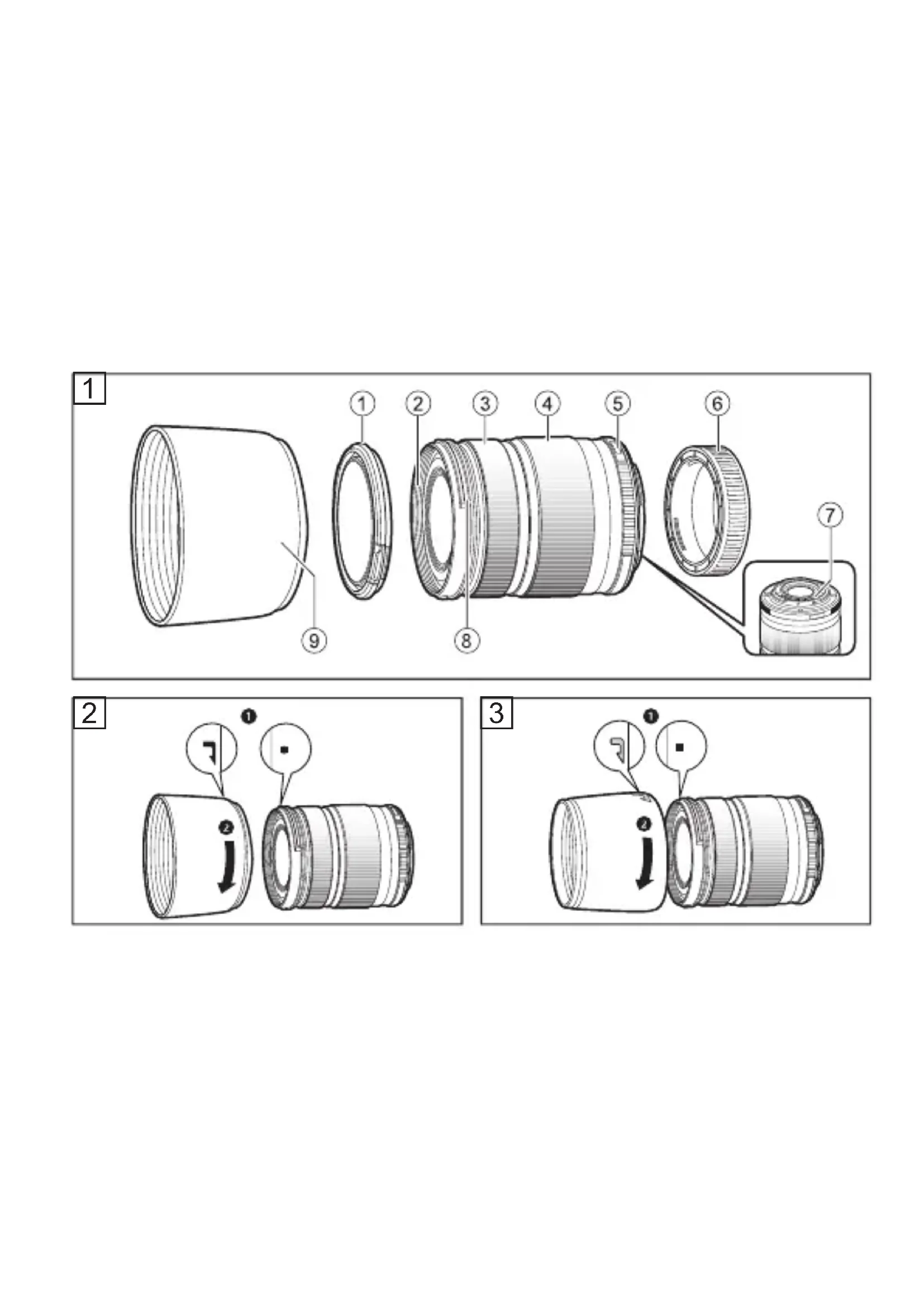 各部の名称(図1) 1フロントキャップ 2フィルター取り付けネジ 3フォーカスリング 4ズームリング 5取り付け指標 6リアキャップ 7電気回路接点 8フード取り付け部 9レンズフード(別売:LH-61D) フードの取り付け方(図2) フードの収納のしかた(図3)