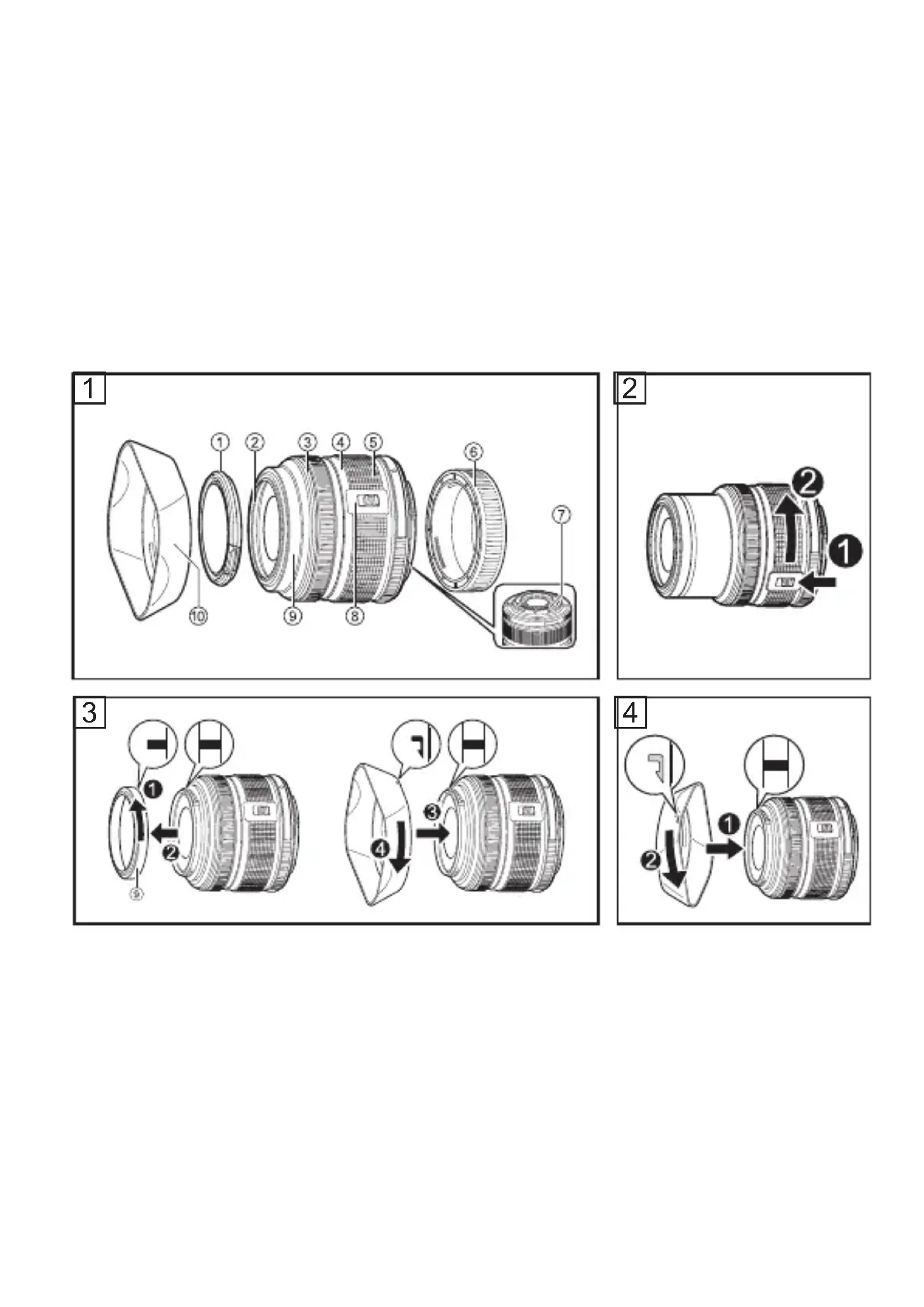 各部の名称(図1) 1フロントキャップ 2フィルター取り付けネジ 3フォーカスリング 4ズームリング 5取り付け指標 6リアキャップ 7電気回路接点 8UNLOCKスイッチ 9デコレーションリング 0レンズフード(別売:LH-40) UNLOCKスイッチの操作方法(図2) UNLOCKスイッチを矢印の方向に押しながら(1)、 ズームリングを回して(2)レンズを収めます。 フードの取り付け方(図3) フード収納のしかた(図4)