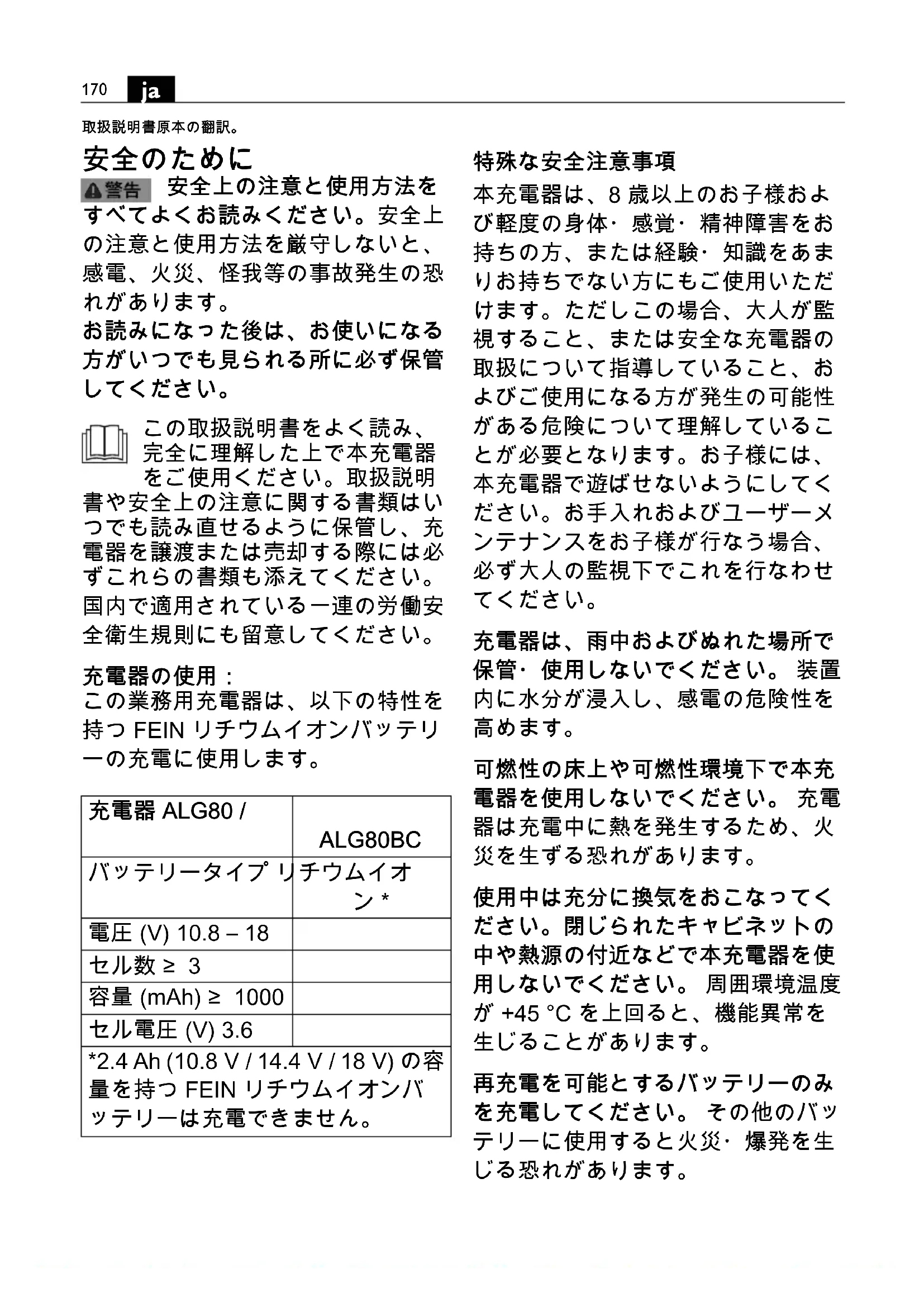 製品保証に関しては、本製品が販売される国で定めら れた法的規定が適用されます。 さらに FEIN 社の保証内 容に従い、保証が適用されます。 本充電器の納品範囲は本取扱説明書に記載され、図示 されたアクセサリーの一部のみが含まれています。