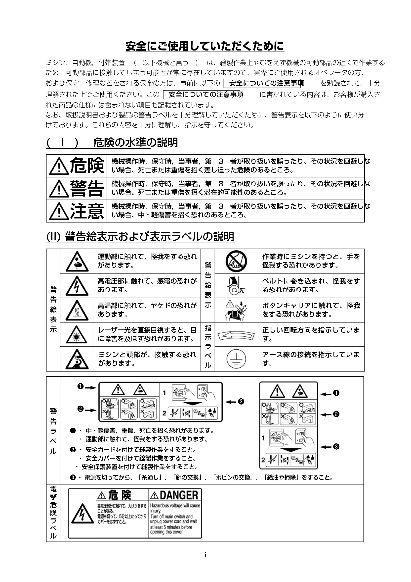 日本語i ミシン,自動機,付帯装置 ( 以下機械と言う ) は、縫製作業上やむをえず機械の可動部品の近くで作業する ため、可動部品に接触してしまう可能性が常に存在していますので、実際にご使用されるオペレータの方、 および保守,修理などをされる保全の方は、事前に以下の 安全についての注意事項 を熟読されて、十分 理解された上でご使用ください。この 安全についての注意事項 に書かれている内容は、お客様が購入さ れた商品の仕様には含まれない項目も記載されています。 なお、取扱説明書および製品の警告ラベルを十分理解していただくために、警告表示を以下のように使い分 けております。これらの内容を十分に理解し、指示を守ってください。