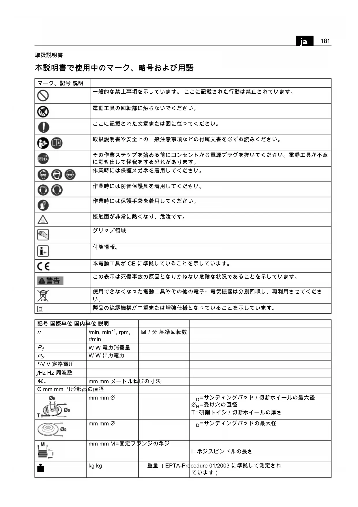 サンディングペーパー使用時における研磨平均振動値m, s, kg, A, mm, V, W, Hz, N, °C, dB, min, m/s m, s, kg, A, mm, V, W, Hz, N, C, dB, min, m/s 国際単位系 (SI)で使用されている基本単位および組 記号 国際単位 国内単位 説明 OBJ_BUCH-0000000033-003.book Page 182 Thursday, February 6, 2014 9:58 AM183