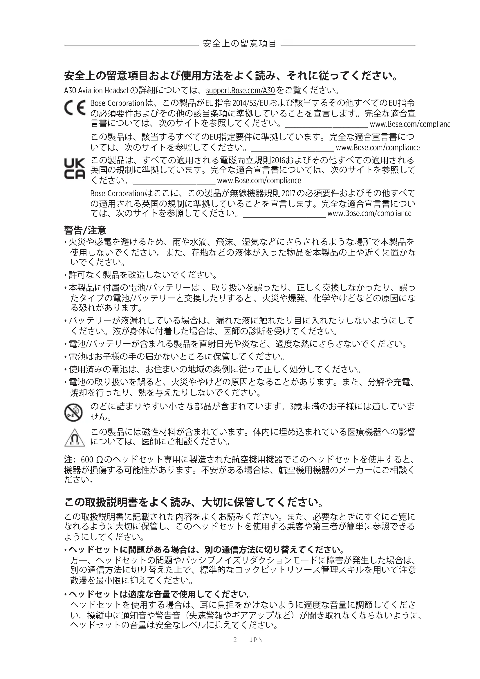 安全上の留意項目および使用方法をよく読み、それに従ってください。 A30 Aviation Headsetの詳細については、support.Bose.com/A30support.Bose.com/A30をご覧ください。 Bose Corporationは、この製品がEU指令2014/53/EUおよび該当するその他すべてのEU指令 の必須要件およびその他の該当条項に準拠していることを宣言します。完全な適合宣 言書については、次のサイトを参照してください。 www.Bose.com/compliancewww.Bose.com/compliance この製品は、該当するすべてのEU指定要件に準拠しています。完全な適合宣言書につ いては、次のサイトを参照してください。 www.Bose.com/compliancewww.Bose.com/compliance この製品は、すべての適用される電磁両立規則2016およびその他すべての適用される 英国の規制に準拠しています。完全な適合宣言書については、次のサイトを参照して