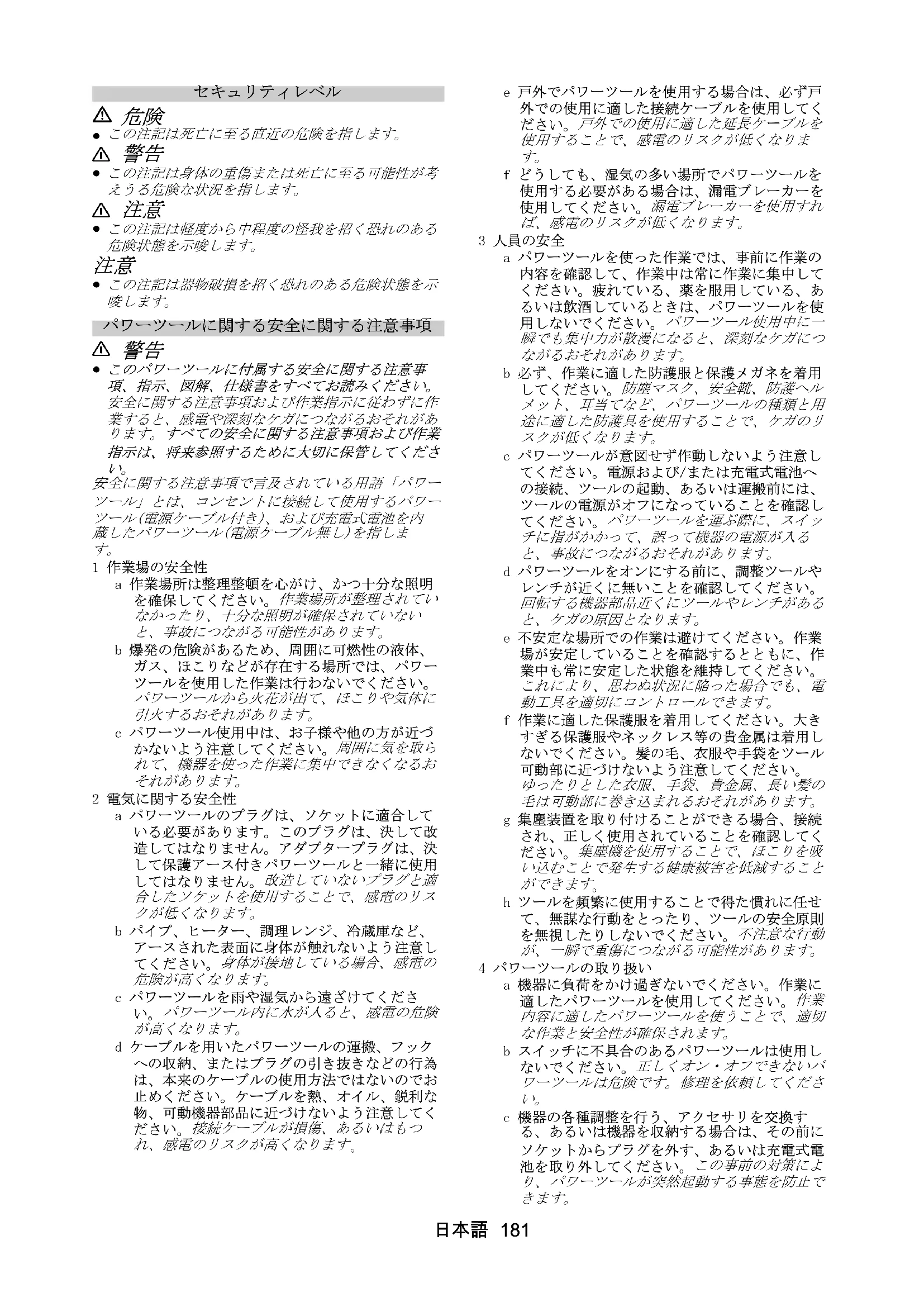 1 作業場の安全性a 作業場所は整理整頓を心がけ、かつ十分な照明を確保してください。 作業場所が整理されてい なかったり、十分な照明が確保されていない と、事故につながる可能性があります。 b 爆発の危険があるため、周囲に可燃性の液体、ガス、ほこりなどが存在する場所では、パワーツールを使用した作業は行わないでください。 パワーツールから火花が出て、ほこりや気体に 引火するおそれがあります。 c パワーツール使用中は、お子様や他の方が近づかないよう注意してください。
