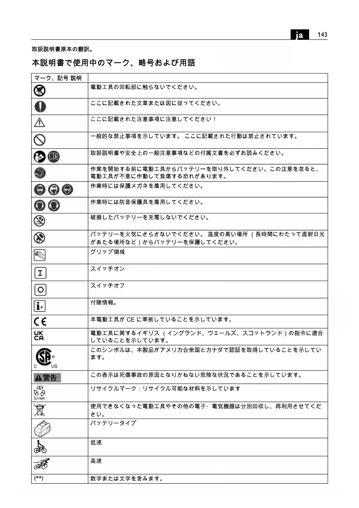 本電動工具が CE に準拠していることを示しています。 電動工具に関するイギリス (イングランド、ウェールズ、スコットランド)の指令に適合 していることを示しています。 このシンボルは、本製品がアメリカ合衆国とカナダで認証を取得していることを示してい