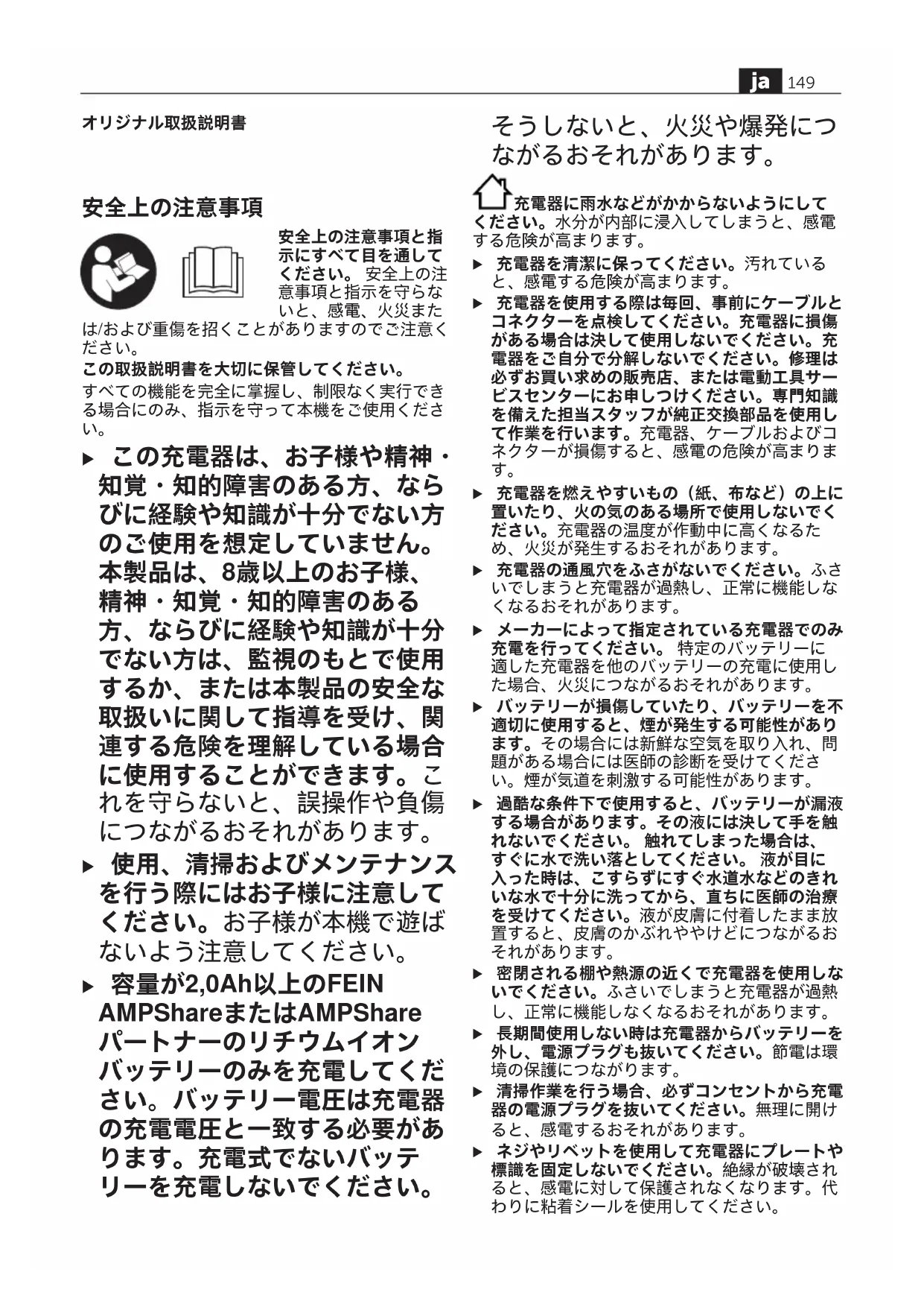 u この充電器は、お子様や精神・ 知覚・知的障害のある方、なら びに経験や知識が十分でない方 のご使用を想定していません。 本製品は、8歳以上のお子様、 精神・知覚・知的障害のある 方、ならびに経験や知識が十分 でない方は、監視のもとで使用 するか、または本製品の安全な 取扱いに関して指導を受け、関 連する危険を理解している場合 に使用することができます。こ れを守らないと、誤操作や負傷 につながるおそれがあります。 u 使用、清掃およびメンテナンス を行う際にはお子様に注意して ください。お子様が本機で遊ば ないよう注意してください。 u 容量が2,0Ah以上のFEIN AMPShareまたはAMPShare パートナーのリチウムイオン バッテリーのみを充電してくだ さい。バッテリー電圧は充電器 の充電電圧と一致する必要があ ります。充電式でないバッテ リーを充電しないでください。 そうしないと、火災や爆発につ ながるおそれがあります。 充電器に雨水などがかからないようにして ください。水分が内部に浸入してしまうと、感電 する危険が高まります。 u 充電器を清潔に保ってください。汚れている と、感電する危険が高まります。 u 充電器を使用する際は毎回、事前にケーブルと コネクターを点検してください。充電器に損傷 がある場合は決して使用しないでください。充 電器をご自分で分解しないでください。修理は 必ずお買い求めの販売店、または電動工具サー ビスセンターにお申しつけください。専門知識 を備えた担当スタッフが純正交換部品を使用し て作業を行います。充電器、ケーブルおよびコ ネクターが損傷すると、感電の危険が高まりま