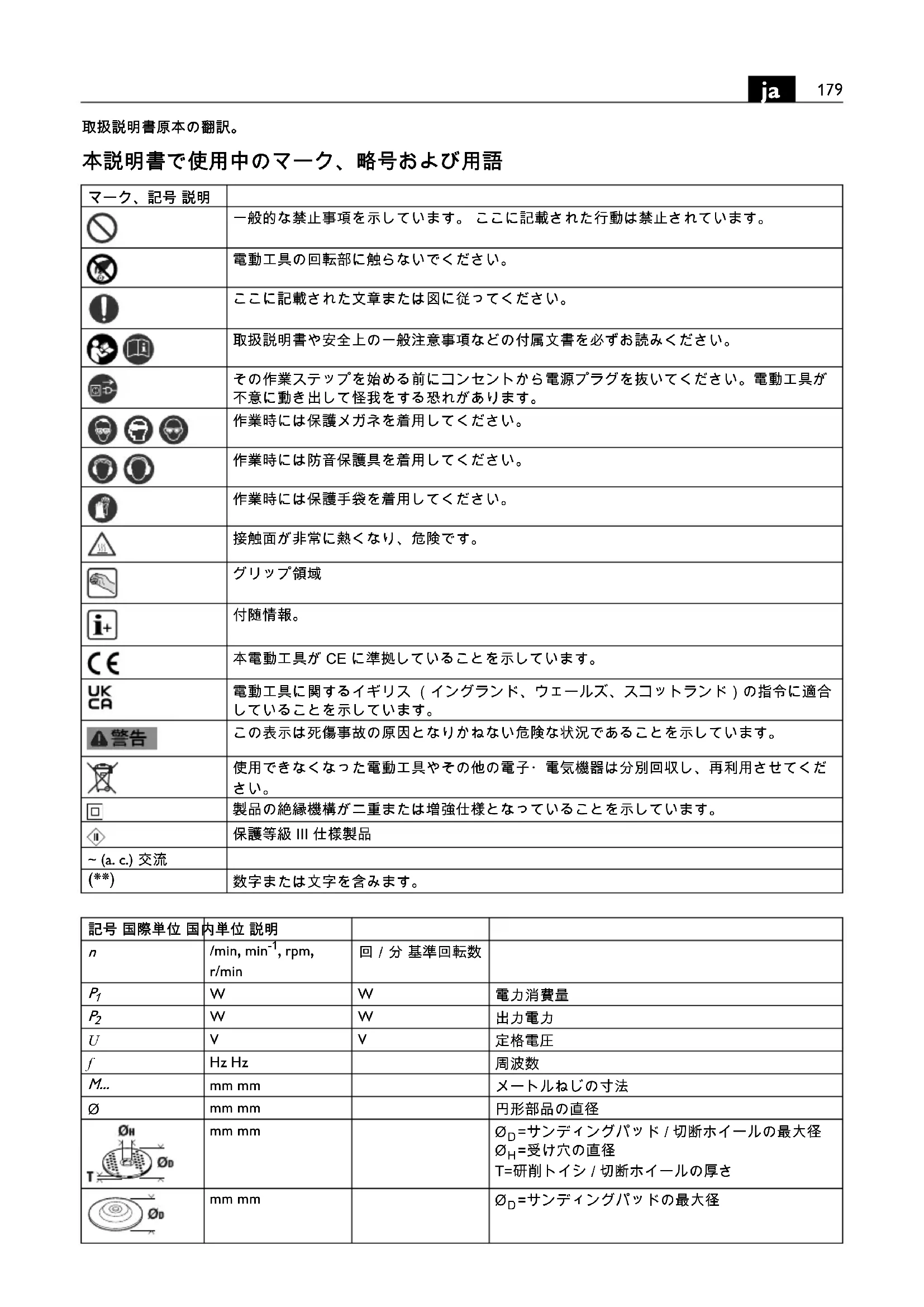 本電動工具が CE に準拠していることを示しています。 電動工具に関するイギリス (イングランド、ウェールズ、スコットランド)の指令に適合 していることを示しています。 この表示は死傷事故の原因となりかねない危険な状況であることを示しています。 使用できなくなった電動工具やその他の電子・電気機器は分別回収し、再利用させてくだ