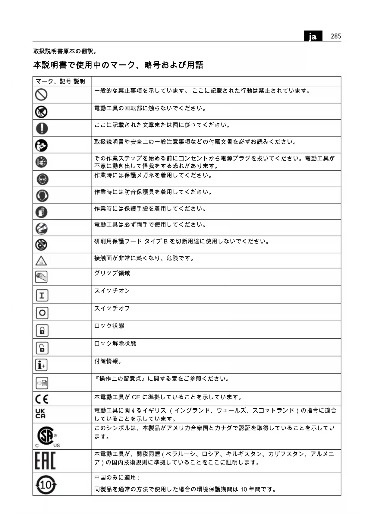 『操作上の留意点』に関する章をご参照ください。 本電動工具が CE に準拠していることを示しています。 電動工具に関するイギリス (イングランド、ウェールズ、スコットランド)の指令に適合 していることを示しています。 このシンボルは、本製品がアメリカ合衆国とカナダで認証を取得していることを示してい