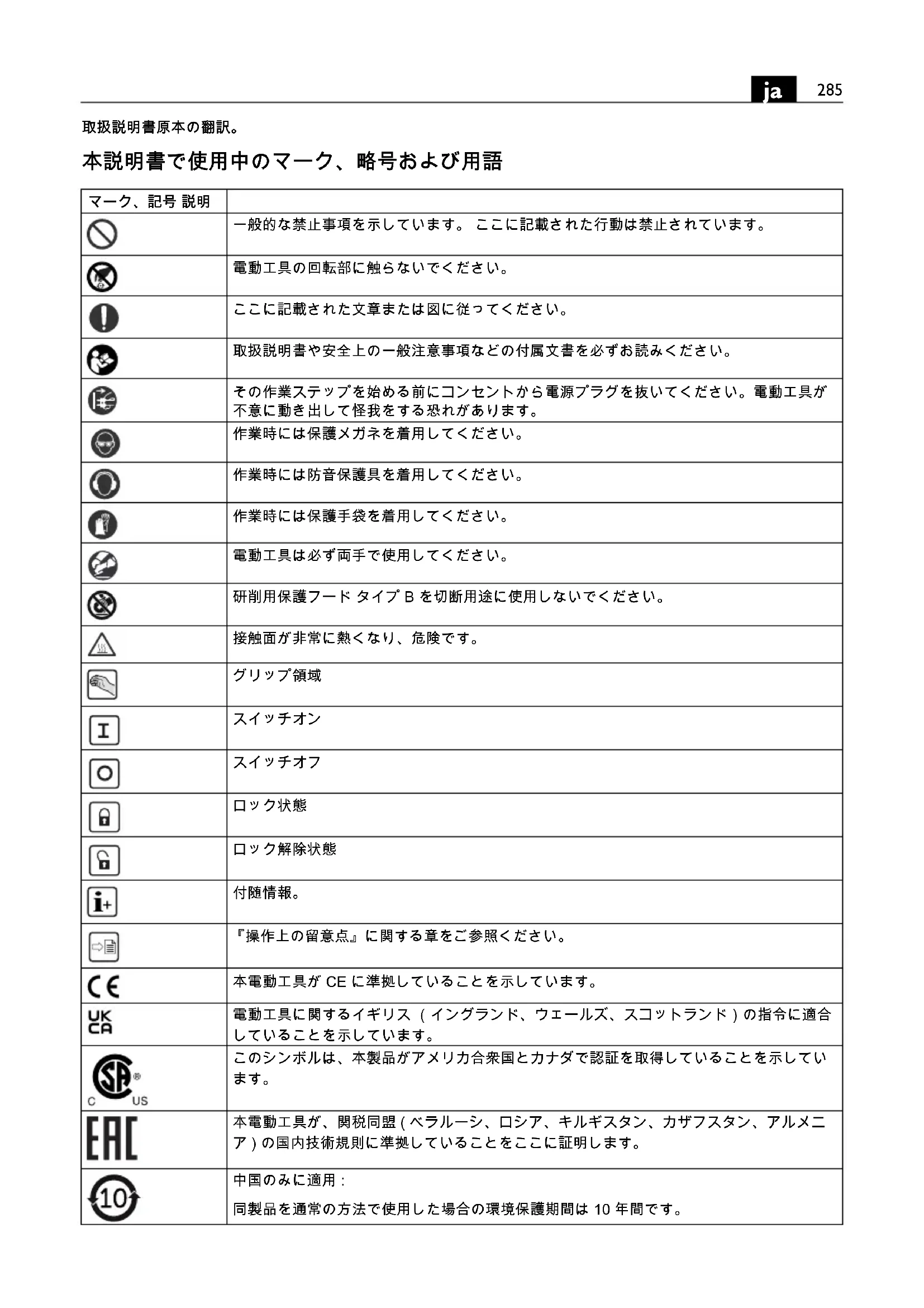 『操作上の留意点』に関する章をご参照ください。 本電動工具が CE に準拠していることを示しています。 電動工具に関するイギリス (イングランド、ウェールズ、スコットランド)の指令に適合 していることを示しています。 このシンボルは、本製品がアメリカ合衆国とカナダで認証を取得していることを示してい