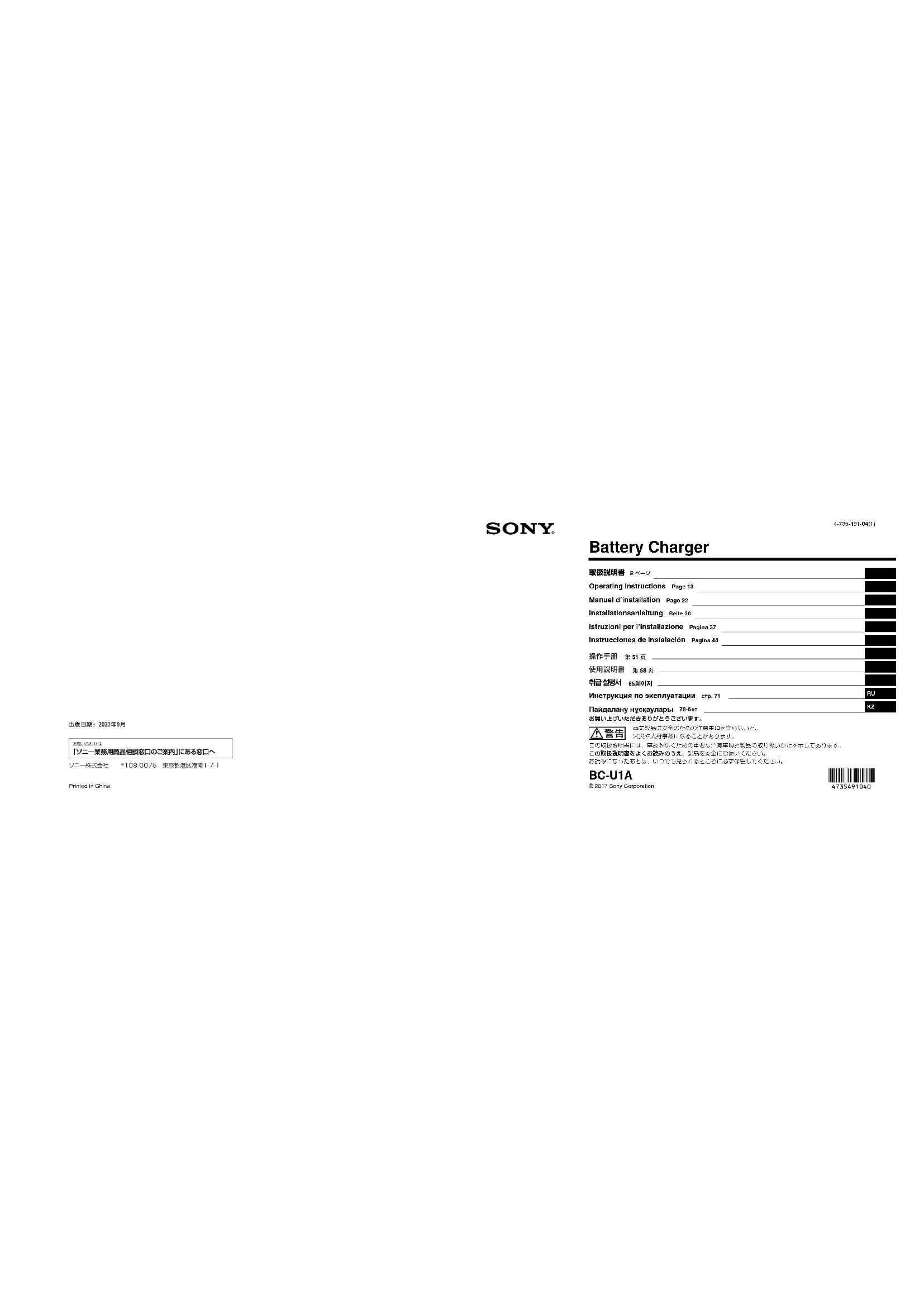 Battery Charger Z:\Data\sony\êiçsíÜwork\PT23G027_SONY_AXS_AR3_ARí«â¡\BC- U\PT23G027_4735491041_JP+\PT23G027_4735491041_JP+\4735491041\4735491041BCU1ASYL\01JP_02GB- BCU1SY\01JP01COV.fm 4-735-491-04(1) お買い上げいただきありがとうございます。 電気製品は安全のための注意事項を守らないと、 火災や人身事故になることがあります。 この取扱説明書には、事故を防ぐための重要な注意事項と製品の取り扱いかたを示してあります。 この取扱説明書をよくお読みのうえ、製品を安全にお使いください。 お読みになったあとは、いつでも見られるところに必ず保管してください。 BC-U1A © 2017 Sony Corporation BC-U1A 4-735-491-04(1) Z:\Data\sony\êiçsíÜwork\PT23G027_SONY_AXS_AR3_ARí«â¡\BC- U\PT23G027_4735491041_JP+\PT23G027_4735491041_JP+\4735491041\4735491041BCU1ASYL\01JP_02GB- BCU1SY\01JP05BCOV.fm Printed in China BC-U1A 4-735-491-04(1) 01JP00BCU1.book 1 ページ 2023年9月5日 火曜日 午後4時45分 BC-U1A 4-735-491-04 (1)2