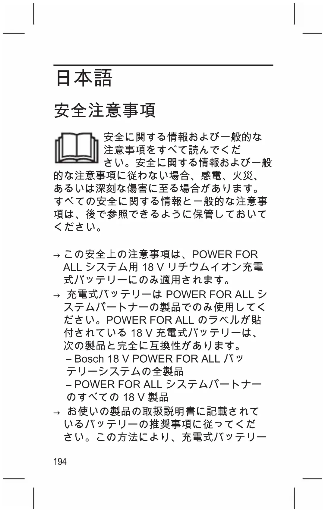 この安全上の注意事項は、POWER FOR ALL システム用 18 V リチウムイオン充電 式バッテリーにのみ適用されます。