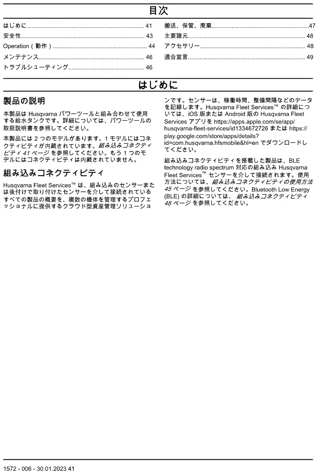 以下の説明は、コネクティビティが搭載された製品のみが対象です。 注記: 最初に Husqvarna Fleet Services に接続した ときに機能による無線通信が有効になります。この接続を有効にするには、接続が完了するまでにポンプがオンになっていなければなりません。その後、機能がオンになります。1. Husqvarna Fleet Services の iOS または Android アプリをダウンロードしてください。2. https://getfleet.husqvarnacp.com を参照してくださ 1572 - 006 - 30.01.2023 45本製品の始動方法