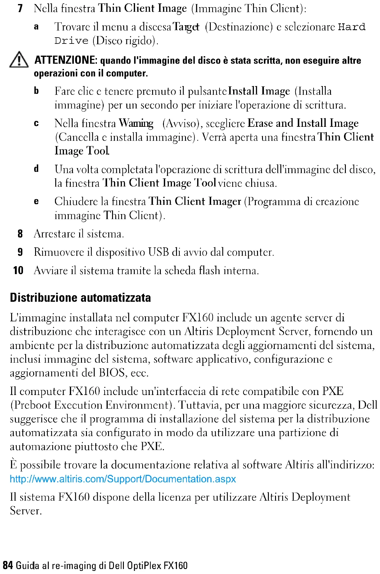b Install Image(イメージのインストール)ボタンをクリックし、1 秒 間押したままにして、書き込み動作を開始します。 c Warning(警告)ウィンドウで、Erase and Install Image(イメージ の消去とインストール)をクリックします。Thin Client Image Tool (Thin Client イメージツール)ウィンドウが開きます。 d ディスクイメージの書き込み動作が完了すると、Thin Client Image Tool (Thin Client イメージツール)ウィンドウが閉じます。 e Thin Client Image(Thin Client イメージ)ウィンドウを閉じます。 8 コンピュータをシャットダウンします。 9 ブータブル USB デバイスをコンピュータから取り外します。 10 内蔵フラッシュカードを使用して、システムを起動します。96 Dell OptiPlex FX160 イメージ再作成ガイド