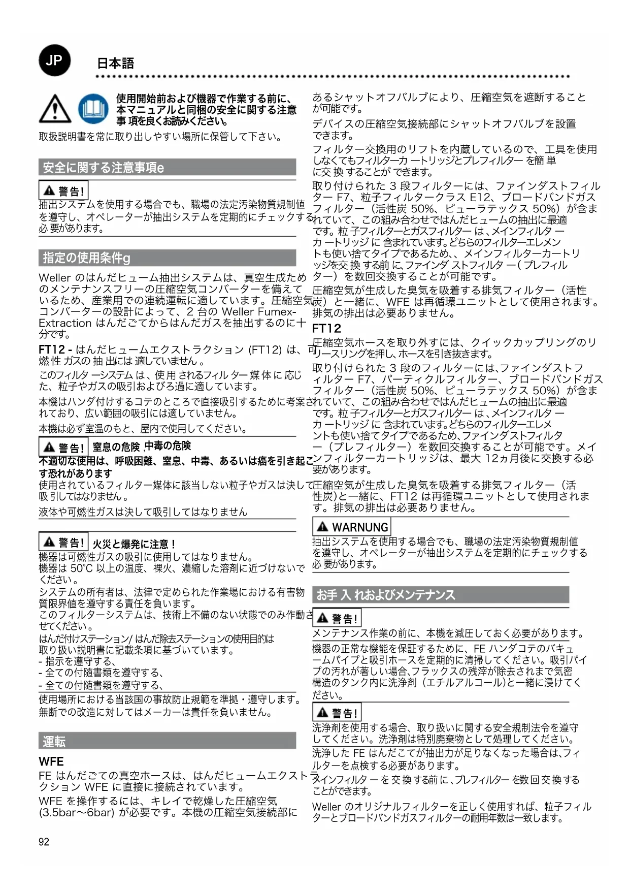 警告:フィルター を 挿 入するときは 、正しい順序と取り付ける位 置 に注 意してください 。汚れたフィルターは有害廃棄物として処 理する必要があります。 修理はWeller製品のトレーニングを受けた専門員によって行 わなければなりません。 オリジナル交換部品だけを使用してください。