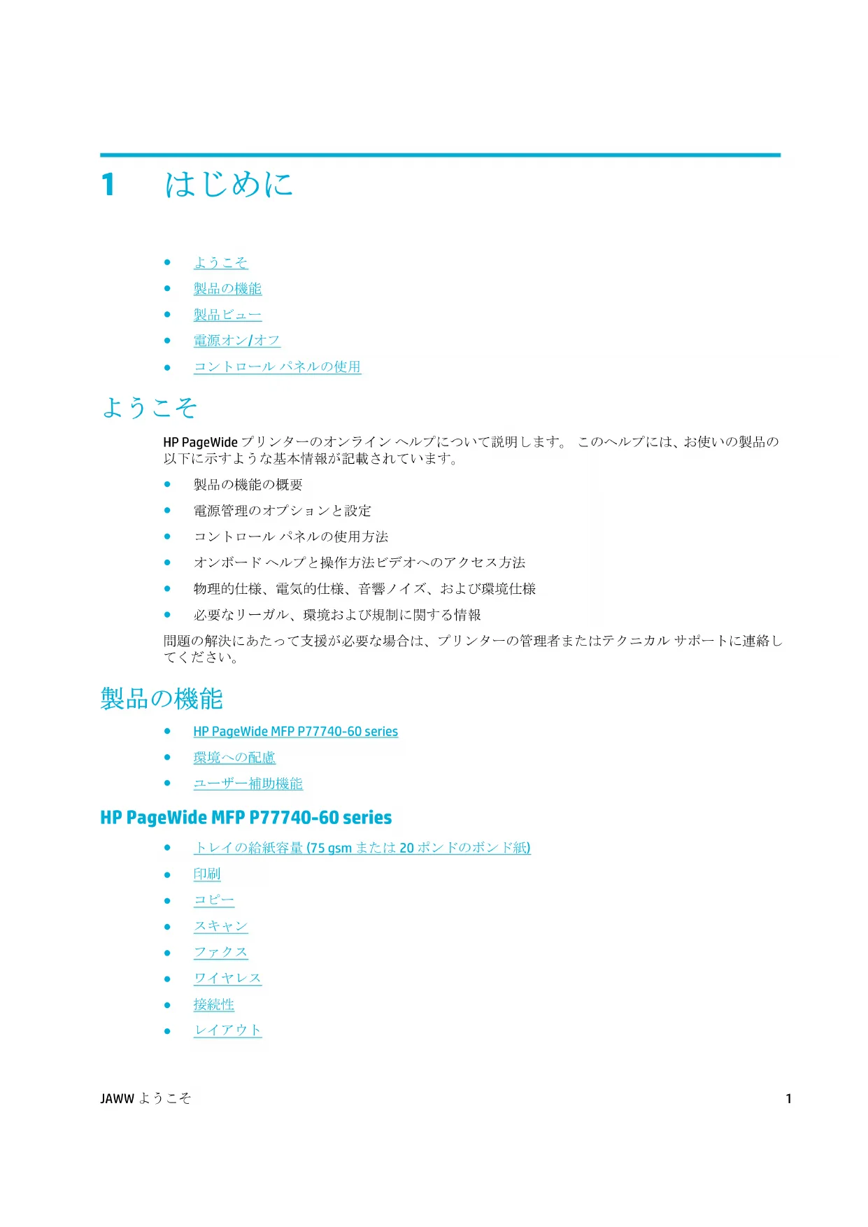 HP PageWide プリンターのオンライン ヘルプについて説明します。 このヘルプには、お使いの製品の 以下に示すような基本情報が記載されています。