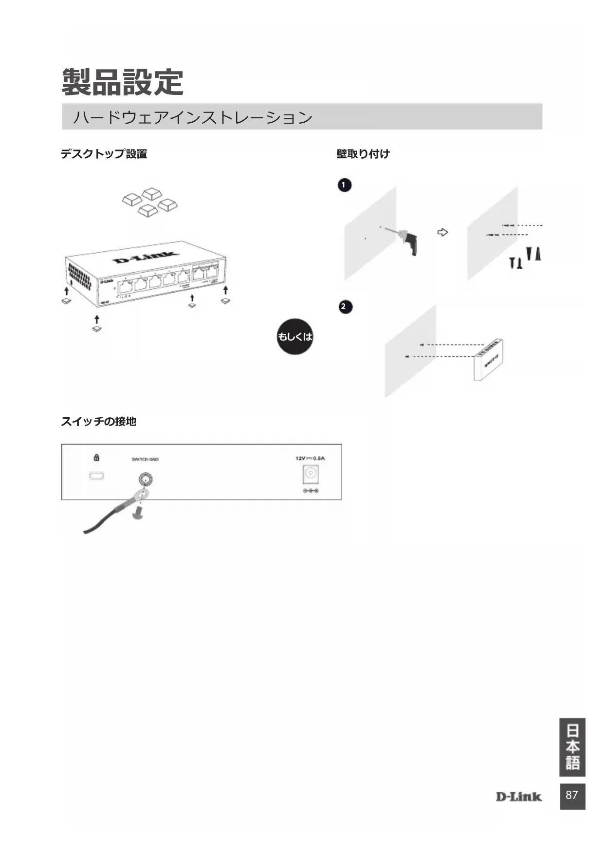 クイックインストールガイド2 ENGLISH PRODUCT SETUP HARDWARE INSTALLATION Desktop Mounting Switch Grounding Wall Mounting