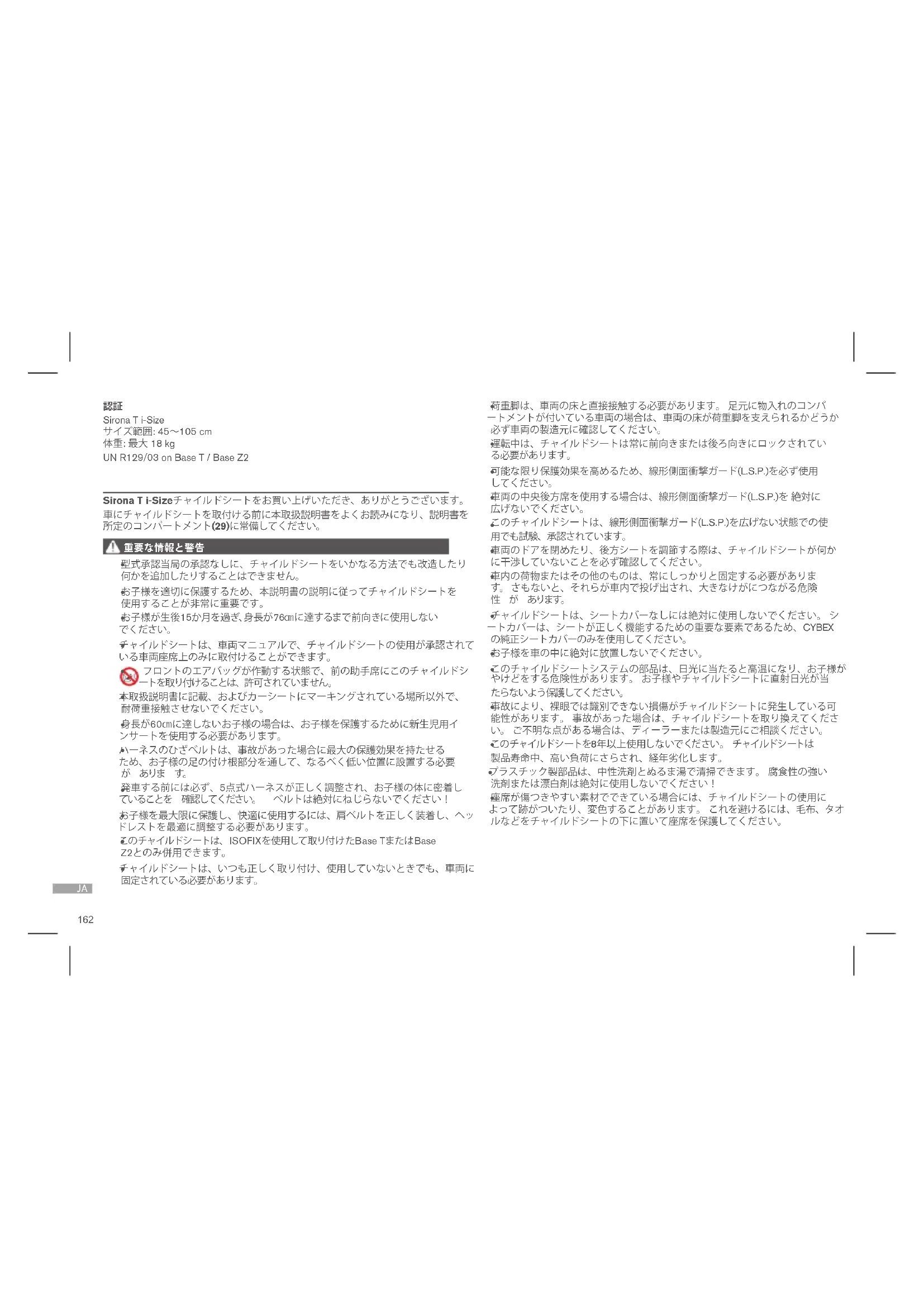 これは、 i-Size強化チャイルドシートシステムで す。 このチャイルドシートは、UN 規制番号 R129/03 on Base T / Base Z2に従って車両の使用説明書に車両のメ ーカーが示した、i-Size互換車両のシート位置での使用が承認されています。 車 両にi-Sizeシートポジションがない場合は、車種リストをご確認ください。 最新版 の車種リストは、www.cybex-online.comから入手いただけます。 すべての承認車で、すべての座席およびリクライニング位置がご使用できるとは