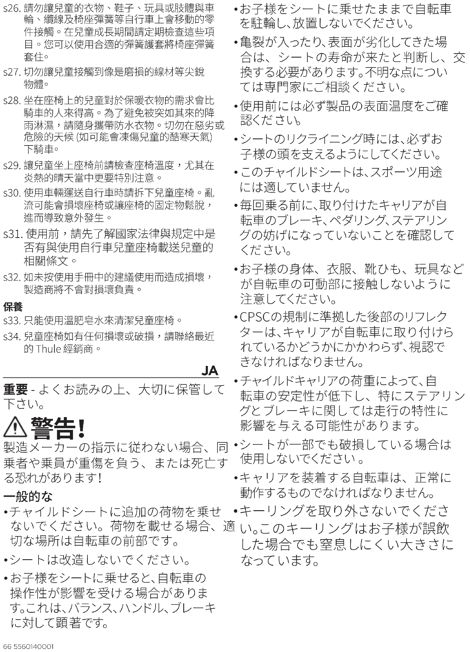 s31. ご使用になる前に、お子様を自転車のチャイ ルドシートに乗せることに関する国内法およ び規制の有無を確認してください。 s32. このオーナーズマニュアルで推奨されていな い方法での使用が原因で発生した損害につ いて、製造者は責任を負いません。