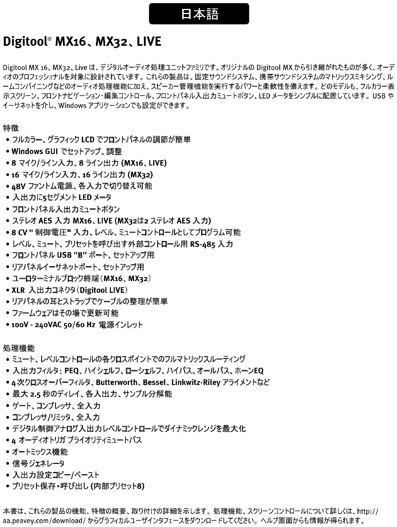 Digitool MX 16、MX32、Live は、デジタルオーディオ処理ユニットファミリです。オリジナルの Digitool MX から引き継がれたものが多く、オーデ ィオのプロフェッショナルを対象に設計されています。 これらの製品は、固定サウンドシステム、携帯サウンドシステムのマトリックスミキシング、ル ームコンバイニングなどのオーディオ処理機能に加え、スピーカー管理機能を実行するパワーと柔軟性を備えます。 どのモデルも、フルカラー表 示スクリーン、フロントナビゲーション・編集コントロール、フロントパネル入出力ミュートボタン、LED メータをシンプルに配置しています。 USB や イーサネットを介し、Windows アプリケーションでも設定ができます。