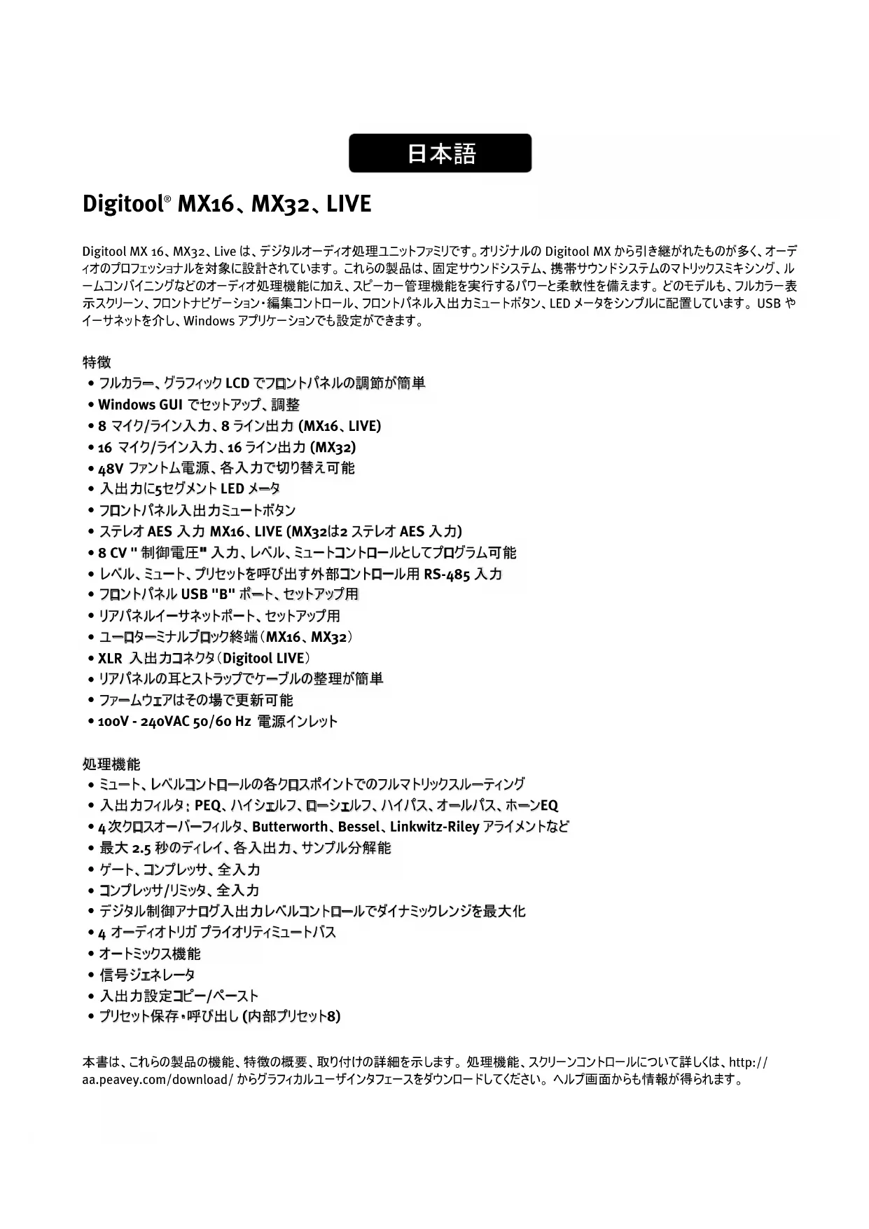 Digitool MX 16、MX32、Live は、デジタルオーディオ処理ユニットファミリです。オリジナルの Digitool MX から引き継がれたものが多く、オーデ ィオのプロフェッショナルを対象に設計されています。 これらの製品は、固定サウンドシステム、携帯サウンドシステムのマトリックスミキシング、ル ームコンバイニングなどのオーディオ処理機能に加え、スピーカー管理機能を実行するパワーと柔軟性を備えます。 どのモデルも、フルカラー表 示スクリーン、フロントナビゲーション・編集コントロール、フロントパネル入出力ミュートボタン、LED メータをシンプルに配置しています。 USB や イーサネットを介し、Windows アプリケーションでも設定ができます。