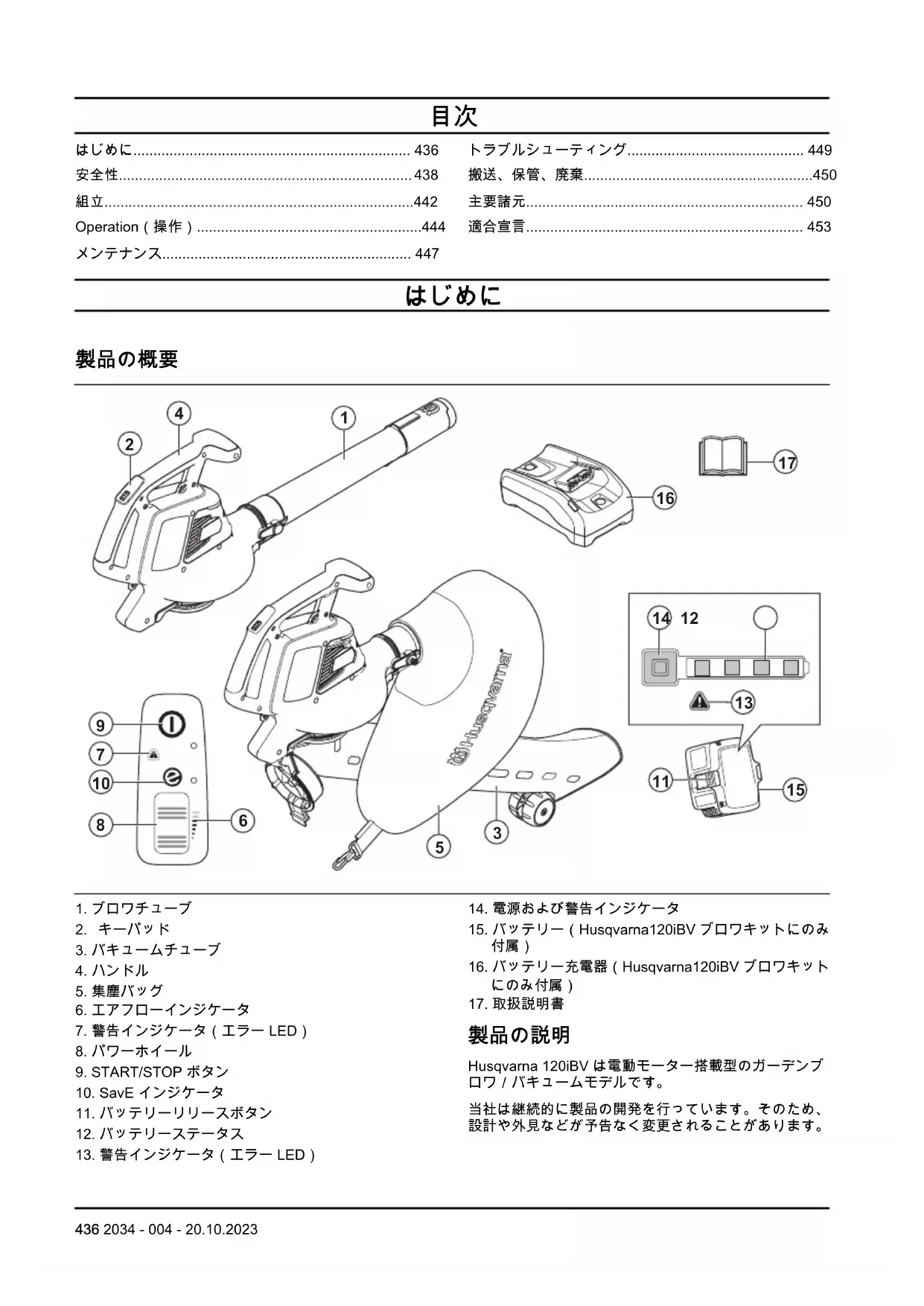 Husqvarna 120iBV は電動モーター搭載型のガーデンブ ロワ/バキュームモデルです。 当社は継続的に製品の開発を行っています。そのため、 設計や外見などが予告なく変更されることがあります。 436 2034 - 004 - 20.10.2023用途 ブロワモード:このブロワは、通路、私道、中庭などか ら、汚れの粒子や刈った草を吹き飛ばすように設計され ています。また、刈った草や、わら、葉を吹き飛ばして 山にしたり、タイルやレンガの角、継ぎ目、隙間から汚 れの粒子を取り除いたりすることもできます。 バキュームモード:バキュームは、乾燥したものを吸い 取るように設計されています。葉、草、小枝、紙片が含