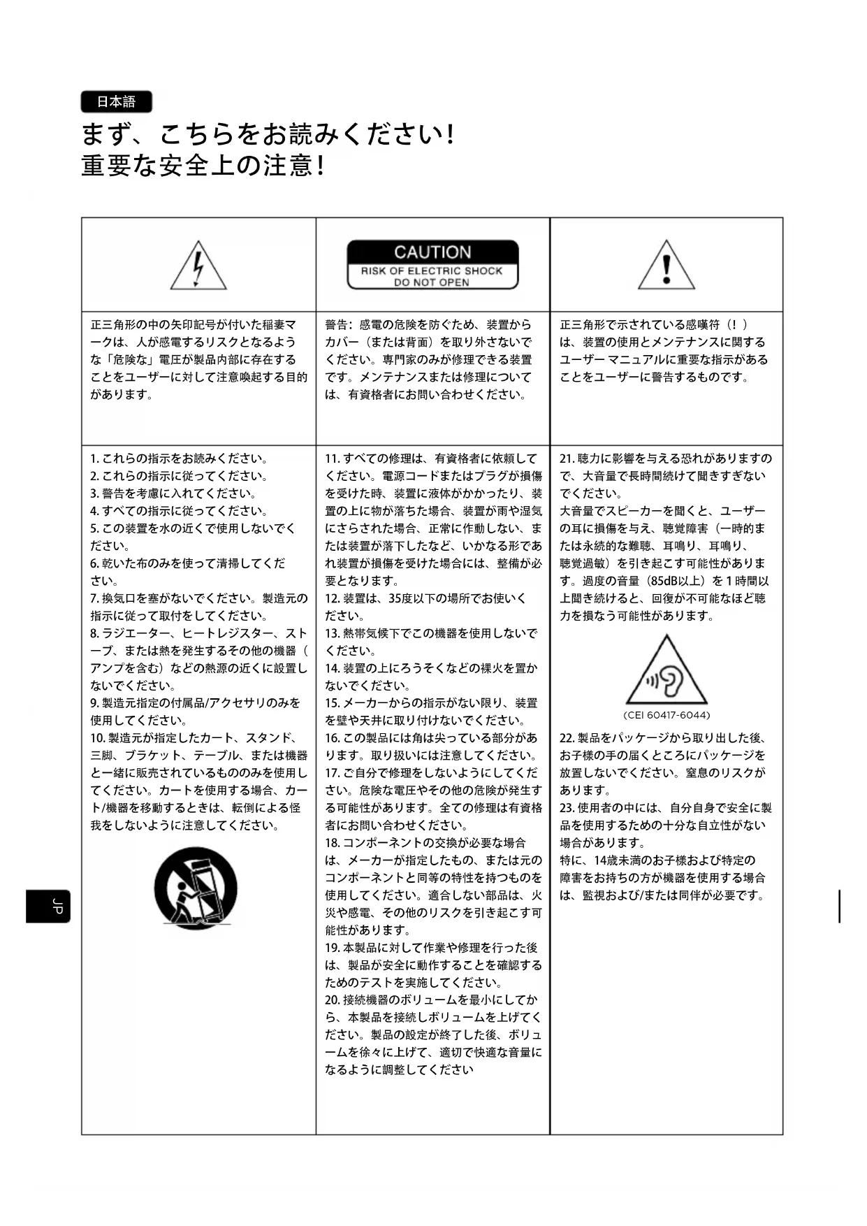 警告:感電の危険を防ぐため、装置から カバー(または背面)を取り外さないで ください。専門家のみが修理できる装置 です。メンテナンスまたは修理について は、有資格者にお問い合わせください。 正三角形で示されている感嘆符(!) は、装置の使用とメンテナンスに関する ユーザー マニュアルに重要な指示がある ことをユーザーに警告するものです。