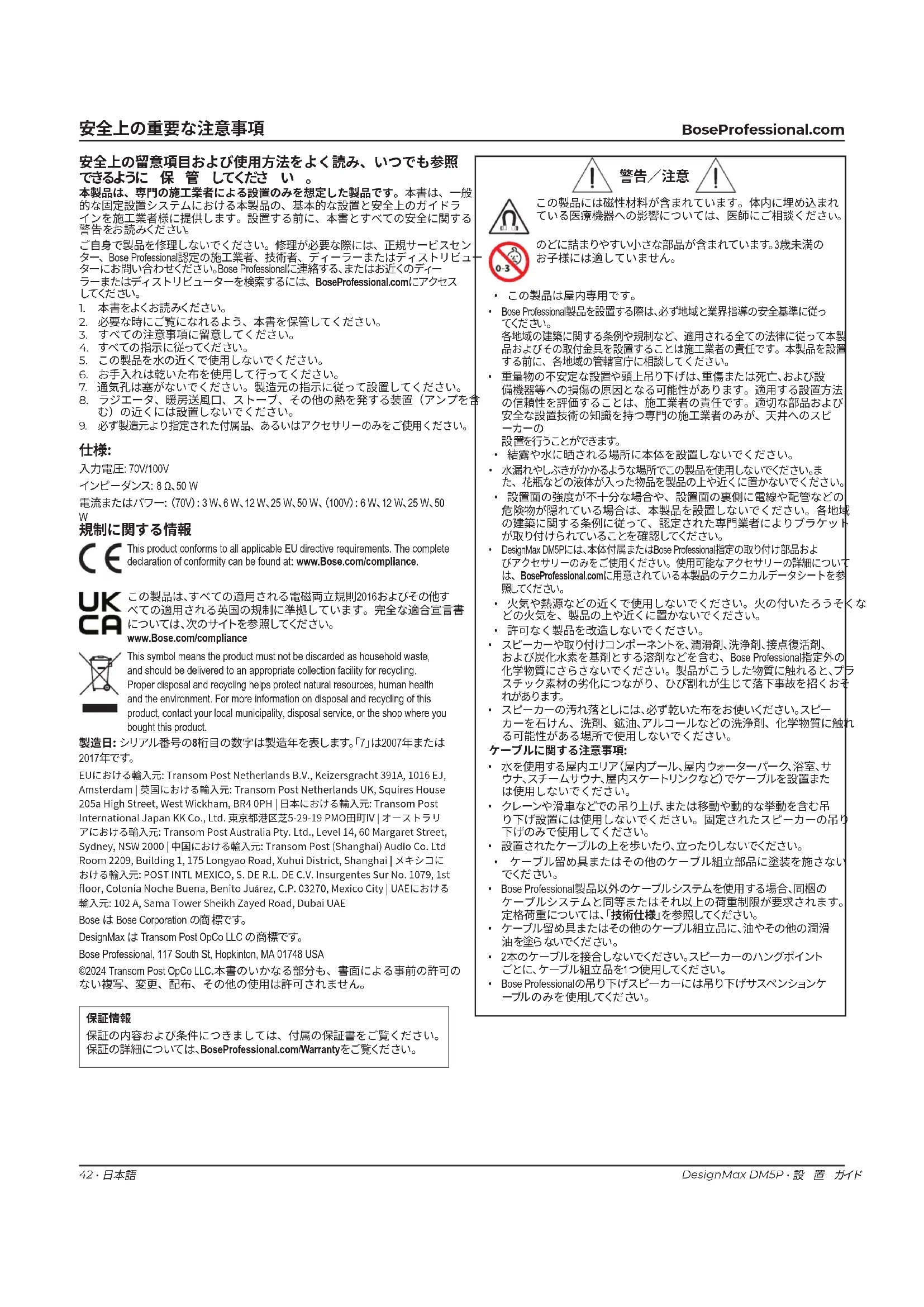 This product conforms to all applicable EU directive requirements. The complete declaration of conformity can be found at: www.Bose.com/compliance. この製品は、すべての適用される電磁両立規則2016およびその他す べての適用される英国の規制に準拠しています。完全な適合宣言書 に つ い て は 、次 の サ イ ト を 参 照 し て く だ さ い 。 www.Bose.com/compliance This symbol means the product must not be discarded as household waste, and should be delivered to an appropriate collection facility for recycling. Proper disposal and recycling helps protect natural resources, human health and the environment. For more information on disposal and recycling of this product, contact your local municipality, disposal service, or the shop where you bought this product. 製造日: シリアル番号の8桁目の数字は製造年を表します。「7」は 2007年または 2017年です。 EUにおける輸入元: Transom Post Netherlands B.V., Keizersgracht 391A, 1016 EJ, Amsterdam | 英国における輸入元: Transom Post Netherlands UK, Squires House 205a High Street, West Wickham, BR4 0PH | 日本における輸入元: Transom Post International Japan KK Co., Ltd. 東京都港区芝5-29-19 PMO田町IV | オーストラリ アにおける輸入元: Transom Post Australia Pty. Ltd., Level 14, 60 Margaret Street, Sydney, NSW 2000 | 中国における輸入元: Transom Post (Shanghai) Audio Co. Ltd Room 2209, Building 1, 175 Longyao Road, Xuhui District, Shanghai | メキシコに おける輸入元: POST INTL MEXICO, S. DE R.L. DE C.V. Insurgentes Sur No. 1079, 1st oor, Colonia Noche Buena, Benito Juárez, C.P. 03270, Mexico City | UAEにおける 輸入元: 102 A, Sama Tower Sheikh Zayed Road, Dubai UAE Bose は Bose Corporation の商 標です。 DesignMax は Transom Post OpCo LLC の商標です。 Bose Professional, 117 South St, Hopkinton, MA 01748 USA ©2024 Transom Post OpCo LLC.本書のいかなる部分も、書面による事前の許可の ない複写、変更、配布、その他の使用は許可されません。
