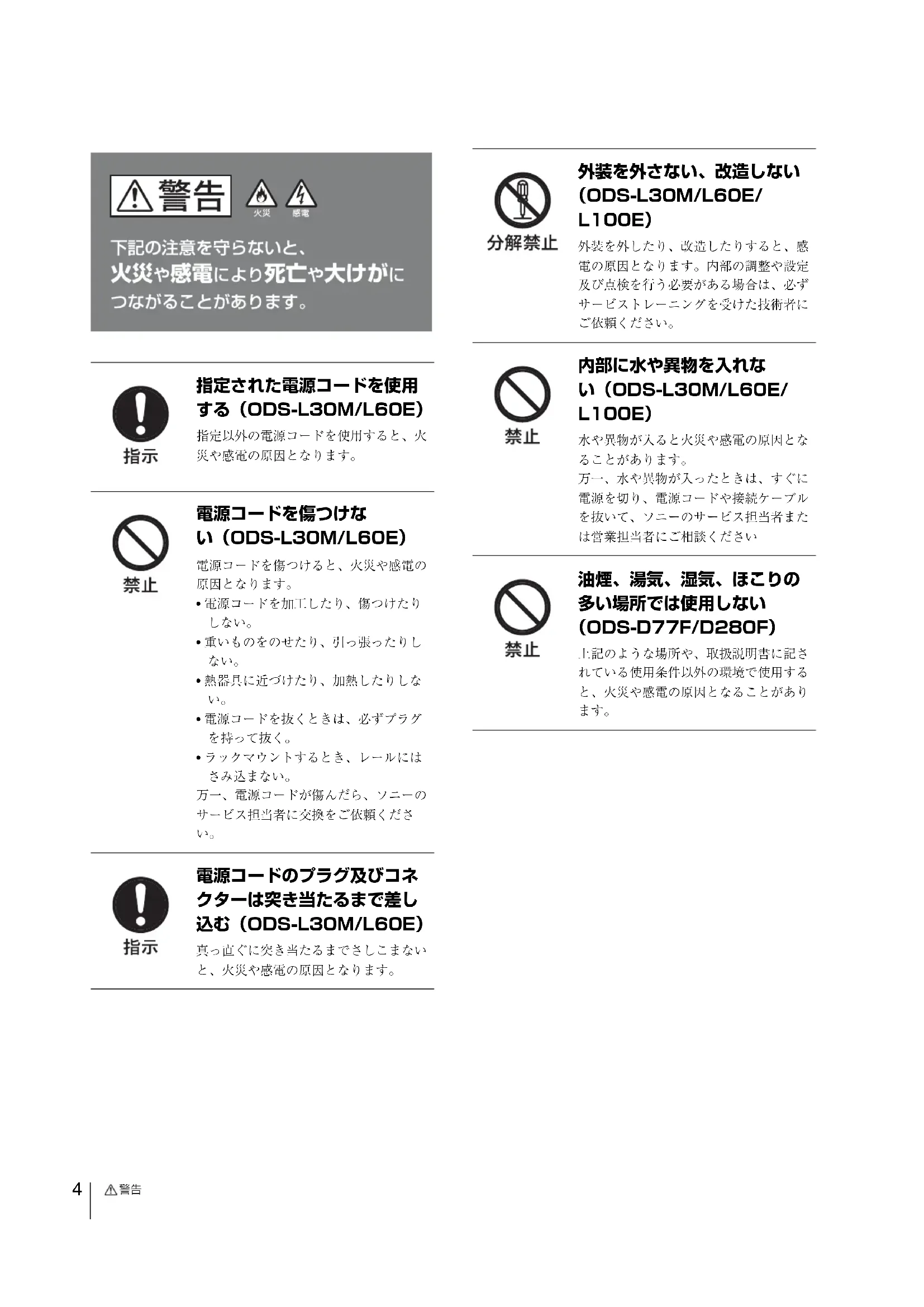 安全アースを取り付けることができない 場合は、ソニーのサービス担当者または 営業担当者にご相談ください。 コード類は正しく配置する 電源コードや接続ケーブルは、足に引っ かけると本機の落下や転倒などによりけ がの原因となることがあります。 十分注意して接続・配置してください。 2 台以上積み上げない(ODS- L30M/L60E/L100E) ラックを使用せずに 2 台以上積み上げる と、機器が落下してけがの原因となるこ