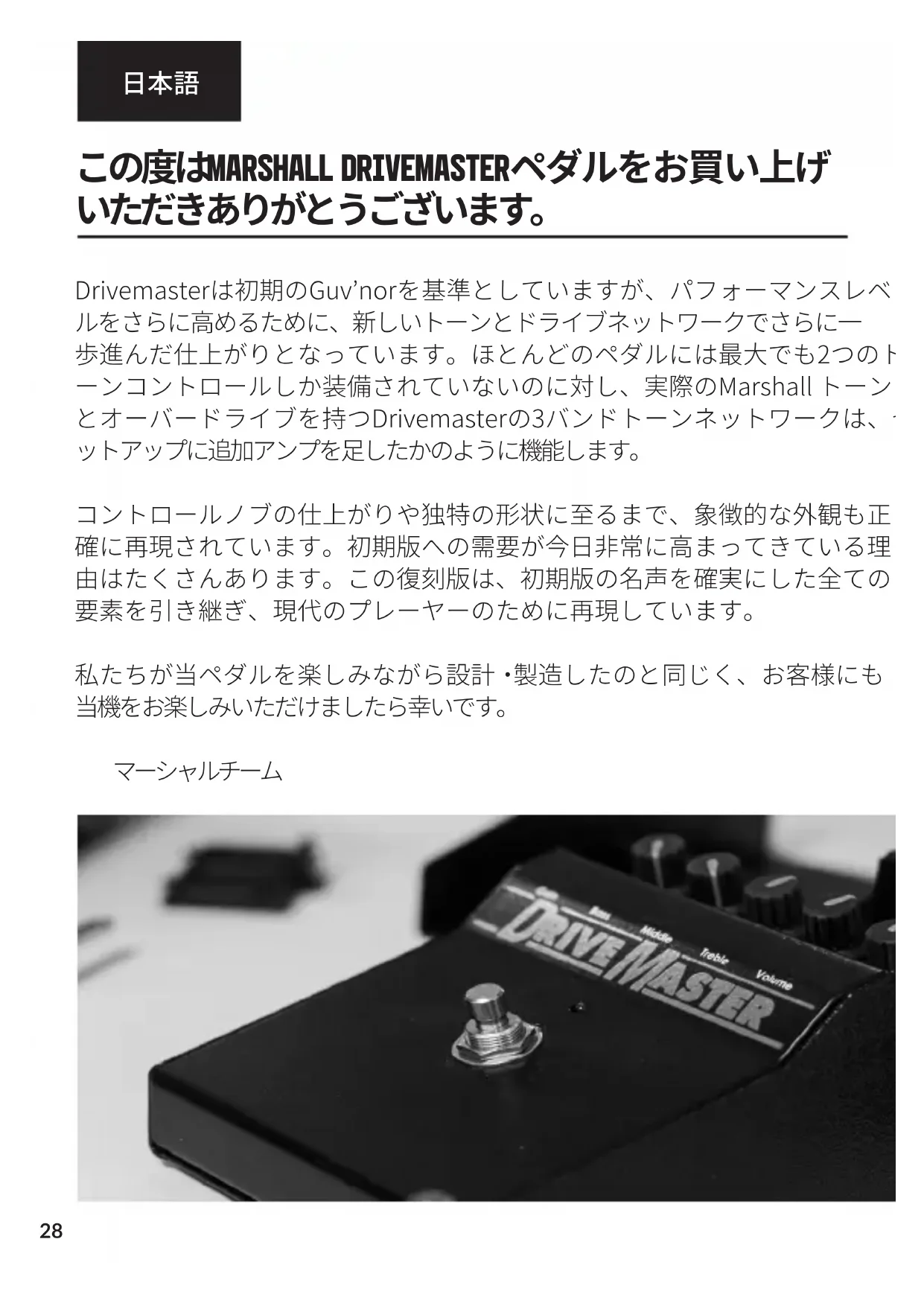 Drivemasterは初期のGuv’norを基準としていますが、パフォーマンスレベ ルをさらに高めるために、新しいトーンとドライブネットワークでさらに一 歩進んだ仕上がりとなっています。ほとんどのペダルには最大でも2つのト ーンコントロールしか装備されていないのに対し、実際のMarshallトーン とオーバードライブを持つDrivemasterの3バンドトーンネットワークは、セ ットアップに追加アンプを足したかのように機能します。 コントロールノブの仕上がりや独特の形状に至るまで、象徴的な外観も正 確に再現されています。初期版への需要が今日非常に高まってきている理 由はたくさんあります。この復刻版は、初期版の名声を確実にした全ての 要素を引き継ぎ、現代のプレーヤーのために再現しています。 私たちが当ペダルを楽しみながら設計・製造したのと同じく、お客様にも 当機をお楽しみいただけましたら幸いです。 マーシャルチーム29