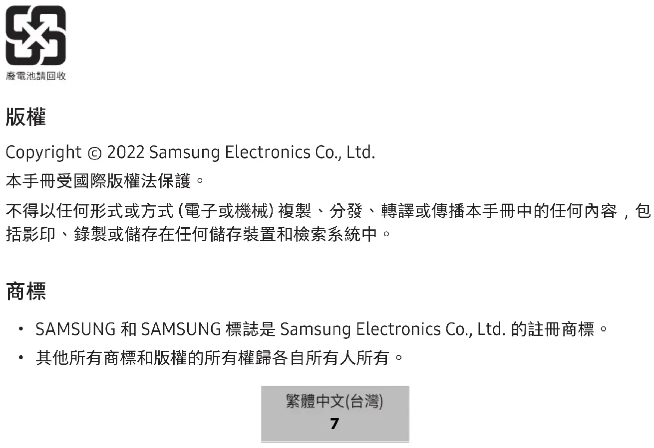 Copyright © 2023 Samsung Electronics Co., Ltd. 本マニュアルは、国際著作権法によって保護されています。 本マニュアルの一部であっても、複写、記録、記録媒体および検索システムへの保存を含め、 電子的または機械的に関わらず、いかなる形態または手段においても、複製、配布、翻訳、配 信することは禁止されています。