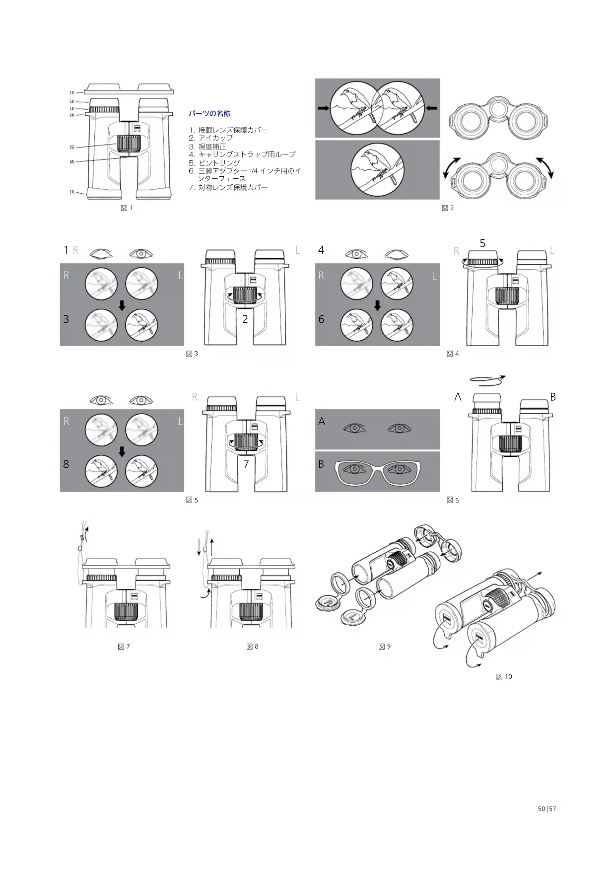 。時計回りに軽く押すことで、アイカップのネジ山が最も 低い位置でロックされます。その後、通常どおり、ロック位置を使用して眼 と接眼レンズとの間隔を調整できます。 キャリングストラップおよび保護カバーの取り付け キャリングストラップ、接眼レンズ保護カバーおよび対物レンズ保護カバー はパッケージに付属しています。接眼レンズ保護カバーは、図
