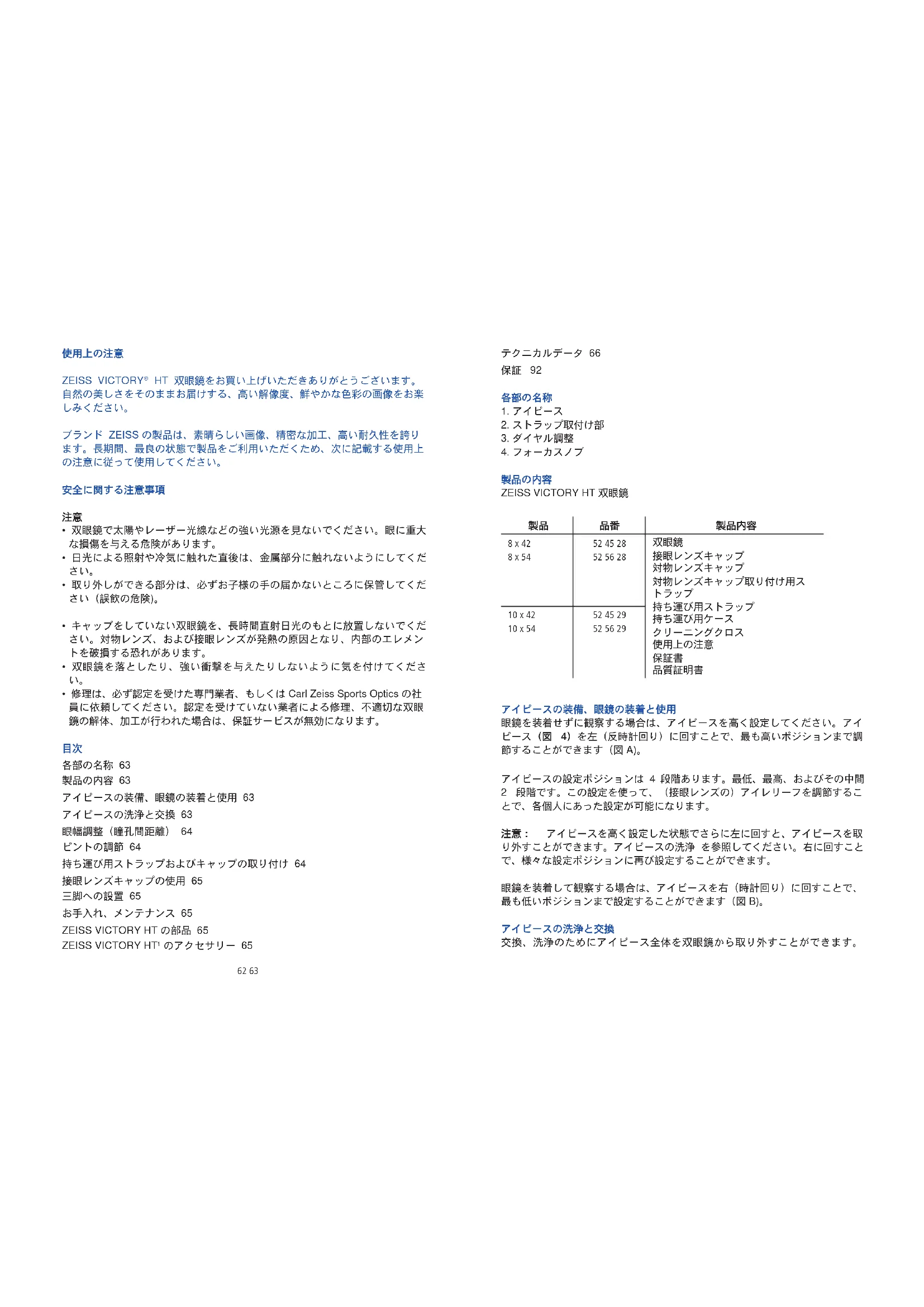 各部の名称 63 製品の内容 63 アイピースの装備、眼鏡の装着と使用 63 アイピースの洗浄と交換 63 眼幅調整(瞳孔間距離) 64 ピントの調節 64 持ち運び用ストラップおよびキャップの取り付け 64 接眼レンズキャップの使用 65 三脚への設置 65 お手入れ、メンテナンス 65