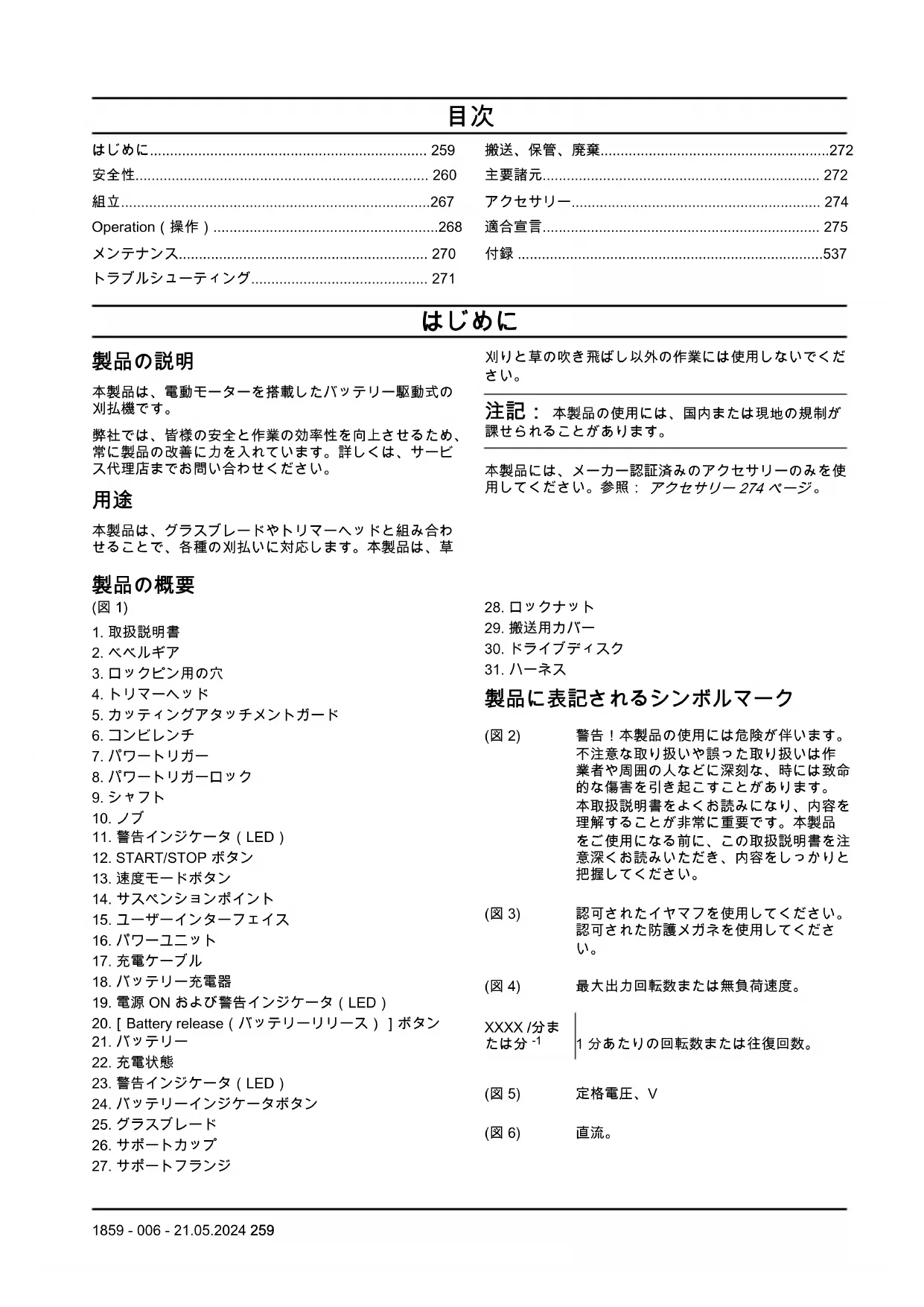 1859 - 006 - 21.05.2024• 詰まった物体を取り除くときや、機器を点検修理す るときは、スイッチがオフになっていて、バッテリ ーパックが取り外されていることを確認してくださ い。 詰まった物体を取り除くときや整備作業中に、 本製品が予期せず作動すると、重傷につながるおそ