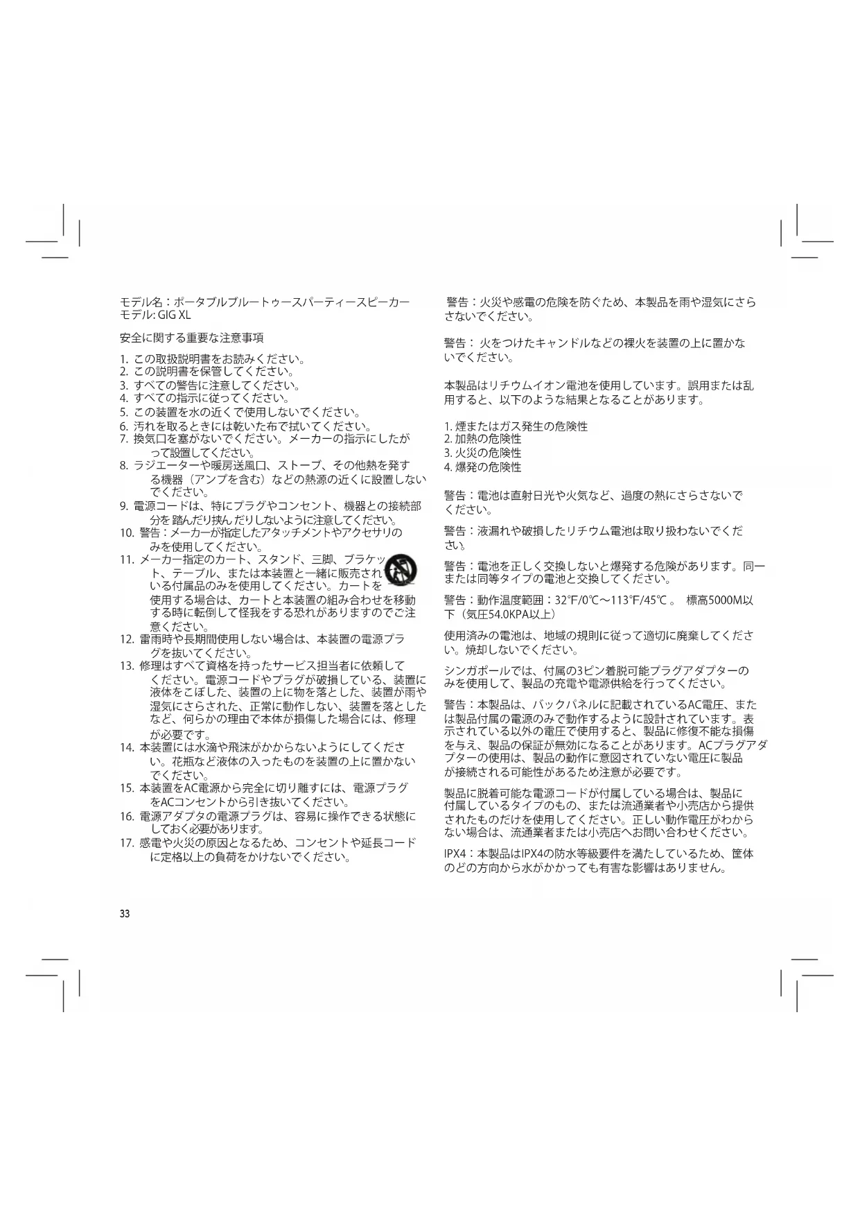 备注:以上标“X”的部件中,部份含有害物质超标是由于目前行业技术水平所限,暂时无法实现替代或减量化。33 モデル名:ポータブルブルートゥースパーティースピーカー モデル: GIG XL 安全に関する重要な注意事項