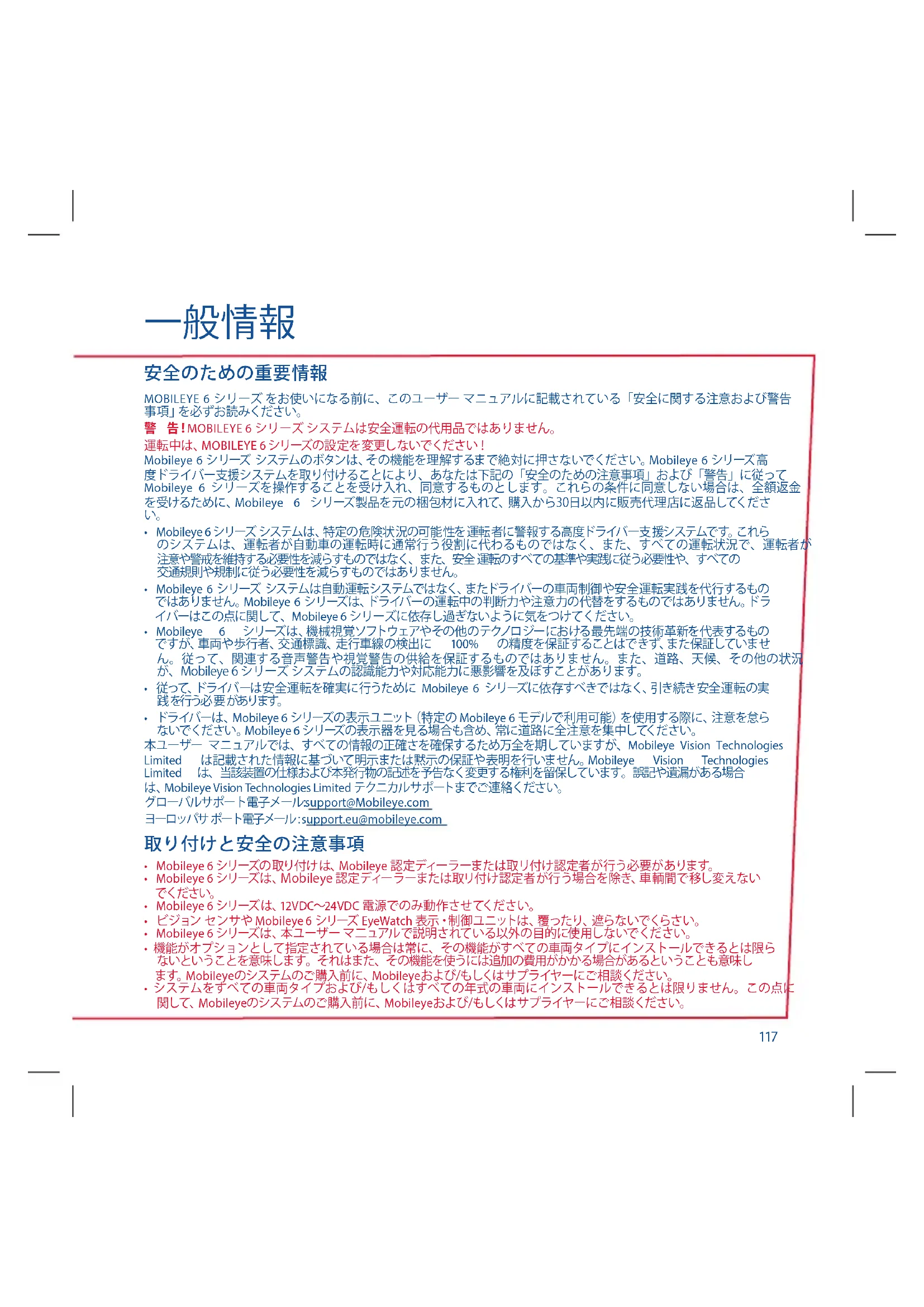 - 従って、ドライバーは安全運転を確実に行うために Mobileye 6 シ リ ーズ に 依 存 す べ き で は な く 、引 き 続 き 安 全 運 転 の 実 践 を行う必 要 があります。