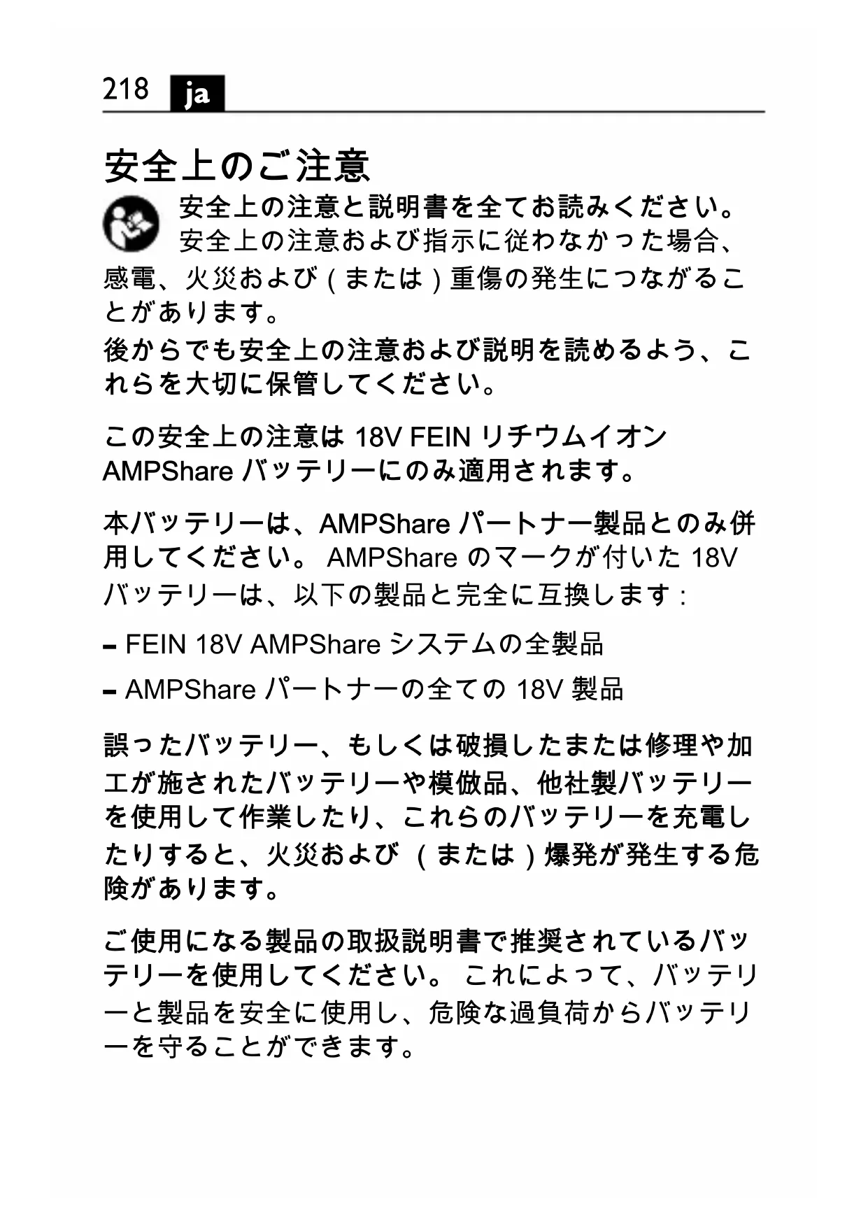 後からでも安全上の注意および説明を読めるよう、こ れらを大切に保管してください。 この安全上の注意は 18V FEIN リチウムイオン AMPShare バッテリーにのみ適用されます。 本バッテリーは、AMPShare パートナー製品とのみ併 用してください。 AMPShare のマークが付いた 18V バッテリーは、以下の製品と完全に互換します : – FEIN 18V AMPShare システムの全製品 – AMPShare パートナーの全ての 18V 製品 誤ったバッテリー、もしくは破損したまたは修理や加 工が施されたバッテリーや模倣品、他社製バッテリー を使用して作業したり、これらのバッテリーを充電し たりすると、火災および (または)爆発が発生する危