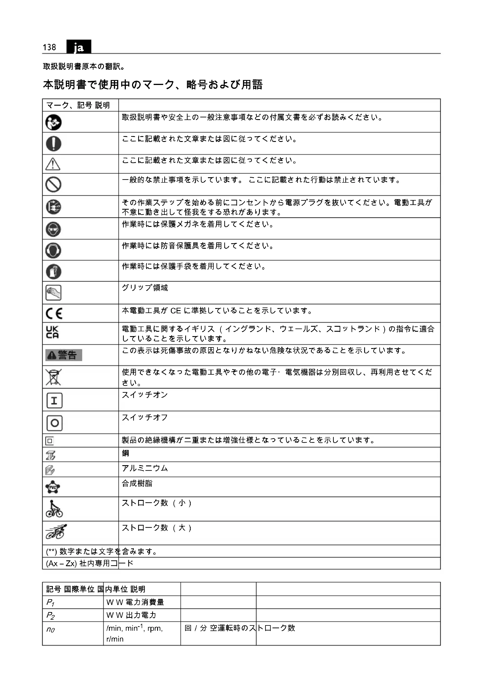 本電動工具が CE に準拠していることを示しています。 電動工具に関するイギリス (イングランド、ウェールズ、スコットランド)の指令に適合 していることを示しています。 この表示は死傷事故の原因となりかねない危険な状況であることを示しています。 使用できなくなった電動工具やその他の電子・電気機器は分別回収し、再利用させてくだ