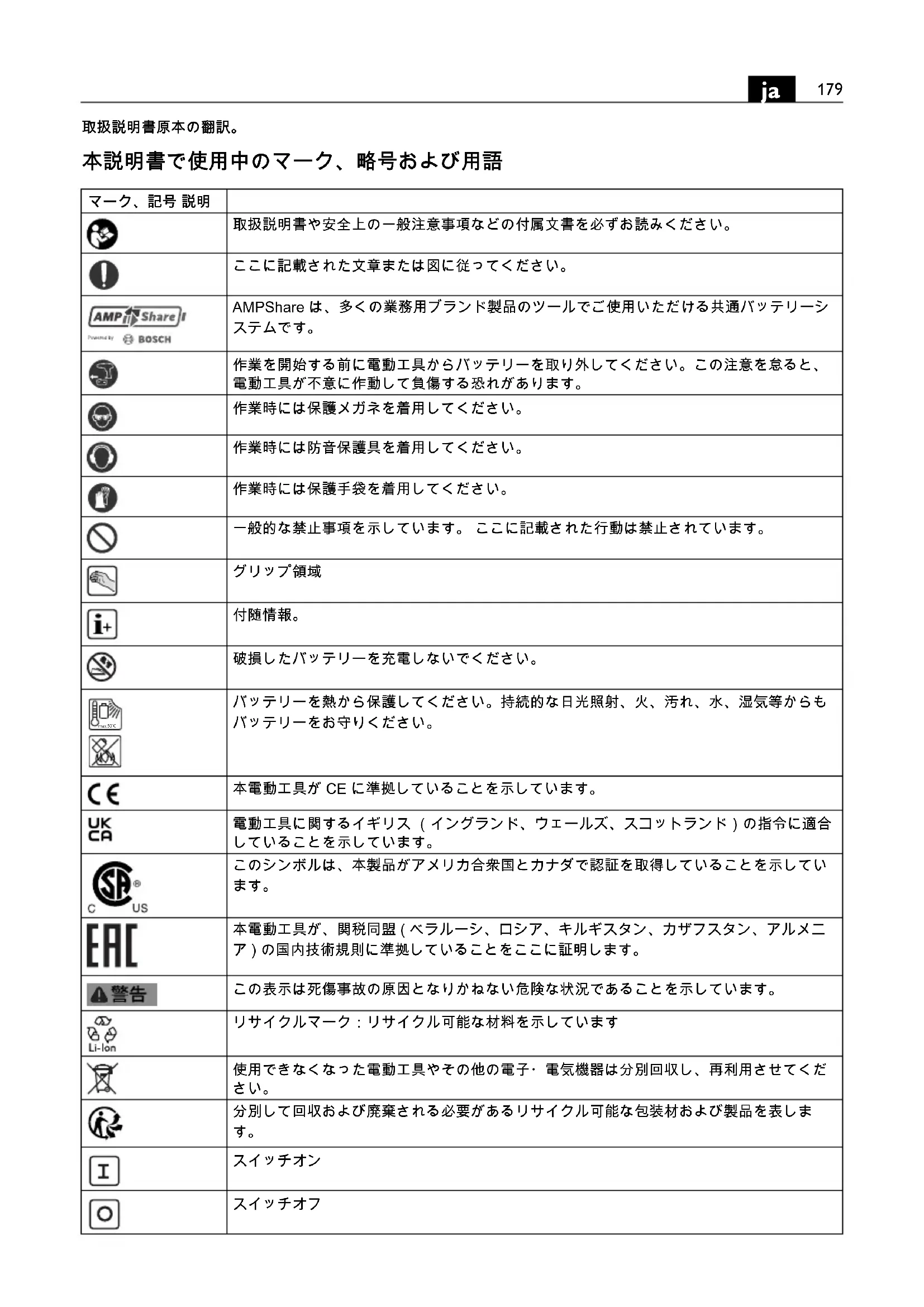 本電動工具が、関税同盟 ( ベラルーシ、ロシア、キルギスタン、カザフスタン、アルメニ ア ) の国内技術規則に準拠していることをここに証明します。 この表示は死傷事故の原因となりかねない危険な状況であることを示しています。 リサイクルマーク:リサイクル可能な材料を示しています 使用できなくなった電動工具やその他の電子・電気機器は分別回収し、再利用させてくだ