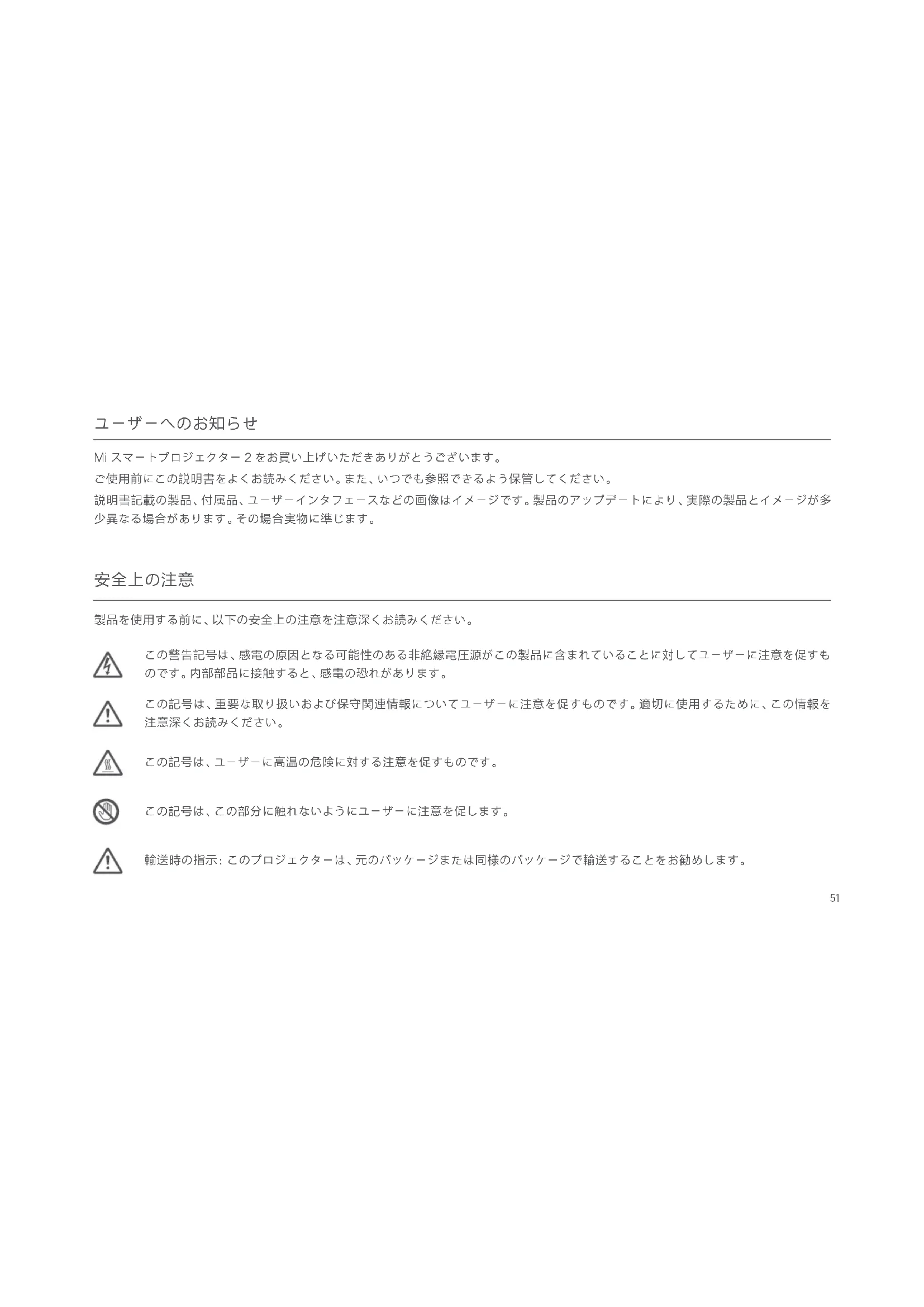 Mi スマートプロジェクター 2 をお買い上げいただきありがとうございます。 ご使用前にこの説明書をよくお読みください。また、いつでも参照できるよう保管してください。 説明書記載の製品、付属品、ユーザーインタフェースなどの画像はイメージです。製品のアップデートにより、実際の製品とイメージが多 少異なる場合があります。その場合実物に準じます。
