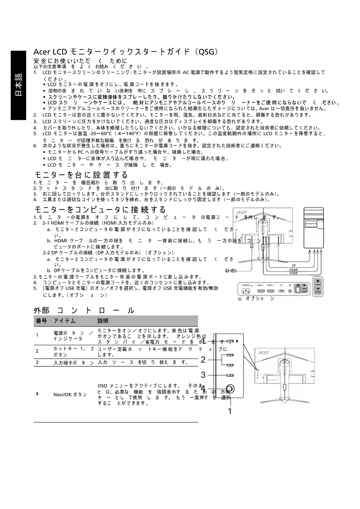 此 B 类数字设备符合加拿大 ICES-003 标准。 Remarque à l'intention des utilisateurs canadiens Cet appareil numérique de la classe B est conforme à la norme NMB-003 du Canada. 《废弃电器电子产品回收处理管理条例》提示性说明 为了更好地关爱及保护地球,当用户不再需要此产品或产品寿命终止时,请遵守国家废弃电器电子产品回收处理相关法律法规,将其交给 当地具有国家认可的回收处理资质的厂商进行回收处理。 欧盟私人家庭用户废旧设备弃置 产品或其包装上的此标志表示不得将此产品与其他生活垃圾一起弃置。反之,您有责任将废旧设备送往指定的废旧电器和 电子设备回收收集点。弃置废旧设备时进行分类收集和回收有助于节约自然资源并确保将其以保护人类健康和环境的方式 回收再利用。有关弃置废旧设备回收站的详细信息,请联系当地市政府办公室、生活垃圾处理服务或产品购买处。 在官方的 Acer 支持网站上查找 Acer 产品的手册及其它文档。 管制认证简体中文日本語 Acer LCD モニタークイックスタートガイド (QSG) 安全にお使いいただ く ために 以下の注意事項 を よ く お読み く だ さ い 。