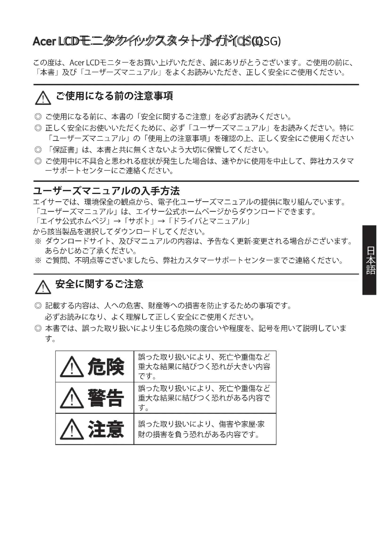 Acer LCDモニタクイックスタートガイド(QSG) この度は、AcerLCDモニターをお買い上げいただき、誠にありがとうございます。ご使用の前に、 「本書」及び「ユーザーズマニュアル」をよくお読みいただき、正しく安全にご使用ください。 ご使用になる前の注意事項 ◎ご使用になる前に、本書の「安全に関するご注意」を必ずお読みください。 ◎正しく安全にお使いいただくために、必ず「ユーザーズマニュアル」をお読みください。特に 「ユーザーズマニュアル」の「使用上の注意事項」を確認の上、正しく安全にご使用ください ◎「保証書」は、本書と共に無くさないよう大切に保管してください。 ◎ご使用中に不具合と思われる症状が発生した場合は、速やかに使用を中止して、弊社カスタマ ーサポートセンターにご連絡ください。 ユーザーズマニュアルの入手方法 エイサーでは、環境保全の観点から、電子化ユーザーズマニュアルの提供に取り組んでいます。 「ユーザーズマニュアル」は、エイサー公式ホームページからダウンロードできます。 「エイサ公式ホムペジ」→「サポト」→「ドライバとマニュアル」 から該当製品を選択してダウンロードしてください。 ※ダウンロードサイト、及びマニュアルの内容は、予告なく更新·変更される場合がございます。 あらかじめご了承ください。 ※ご質問、不明点等ございましたら、弊社カスタマーサポートセンターまでご連絡ください。