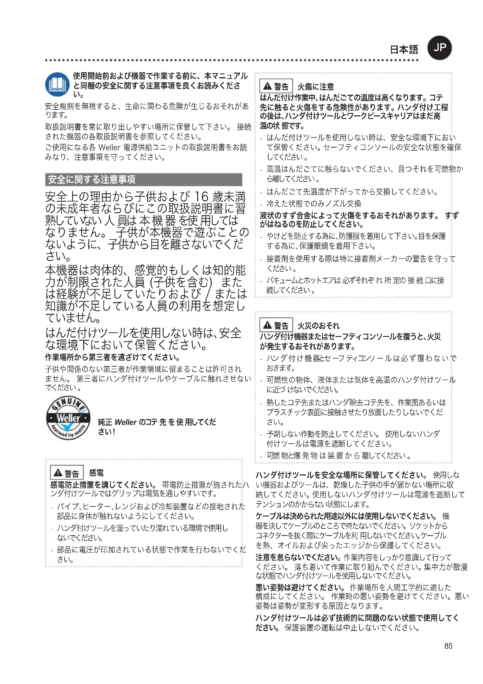 取扱説明書を常に取り出しやすい場所に保管して下さい。 接続 された機器の各取扱説明書を参照してください。 ご使用になる各 Weller 電源供給ユニットの取扱説明書をお読 みなり、注意事項を守ってください。