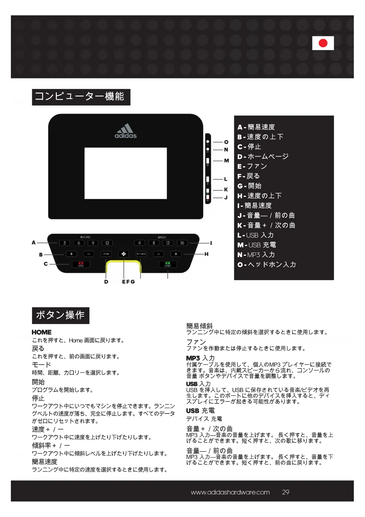 A - 簡易速度 B - 速度の上下 C - 停止 D - ホームページ E - ファン F - 戻る G - 開始 H - 速度の上下 I - 簡易速度 J - 音量—/前の曲 K - 音量+/次の曲