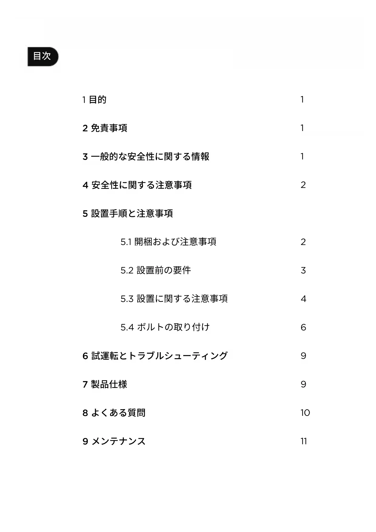 6 試運転とトラブルシューティング 7 製品仕様 8 よくある質問 9 メンテナンス